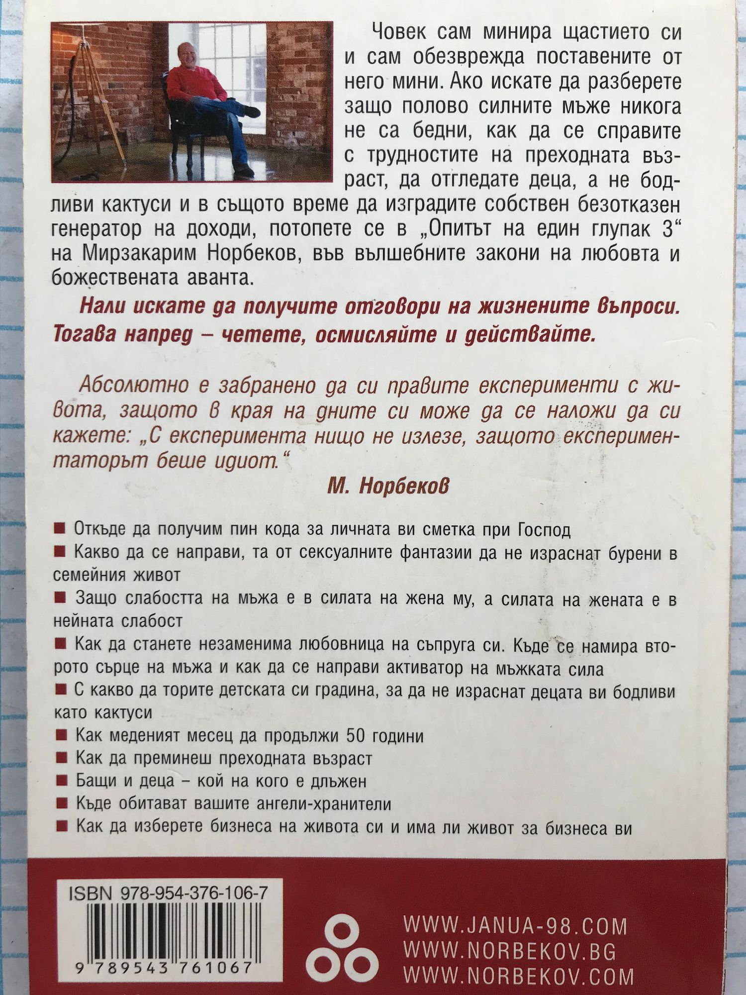Човек сам минира щастието си и сам обезврежда поставените от него мини. Ако искате да разберете защо полово силните мъже никога не са бедни, как да се справите с трудностите на преходната възраст, да отгледате деца, а не бодливи кактуси и в същото време да изградите собствен безотказен генератор на доходи, потопете се в „Опитът на един глупак 3“ на Мирзакарим Норбеков, във вълшебните закони на любовта и божествената аванта. Нали искате да получите отговори на жизнените въпроси. Тогава напред – четете, осмисляйте и действайте. Абсолютно е забранено да си правите експерименти с живота, защото в края на дните си може да се наложи да си кажете: „С експеримента нищо не излезе, защото експериментаторът беше идиот.“ М. Норбеков Откъде да получим пин кода за личната ви сметка при Господ Какво да се направи, та от сексуалните фантазии да не израснат бурени в семейния живот Защо слабостта на мъжа е в силата на жена му, а силата на жената е в нейната слабост Как да станете незаменима любовница на съпруга си. Къде се намира второто сърце на мъжа и как да се направи активатор на мъжката сила С какво да торите детската си градина, за да не израснат децата ви бодливи като кактуси Как меденият месец да продължи 50 години Как да преминеш преходната възраст Бащи и деца – кой на кого е длъжен Къде обитават вашите ангели-хранители Как да изберете бизнеса на живота си и има ли живот за бизнеса ви