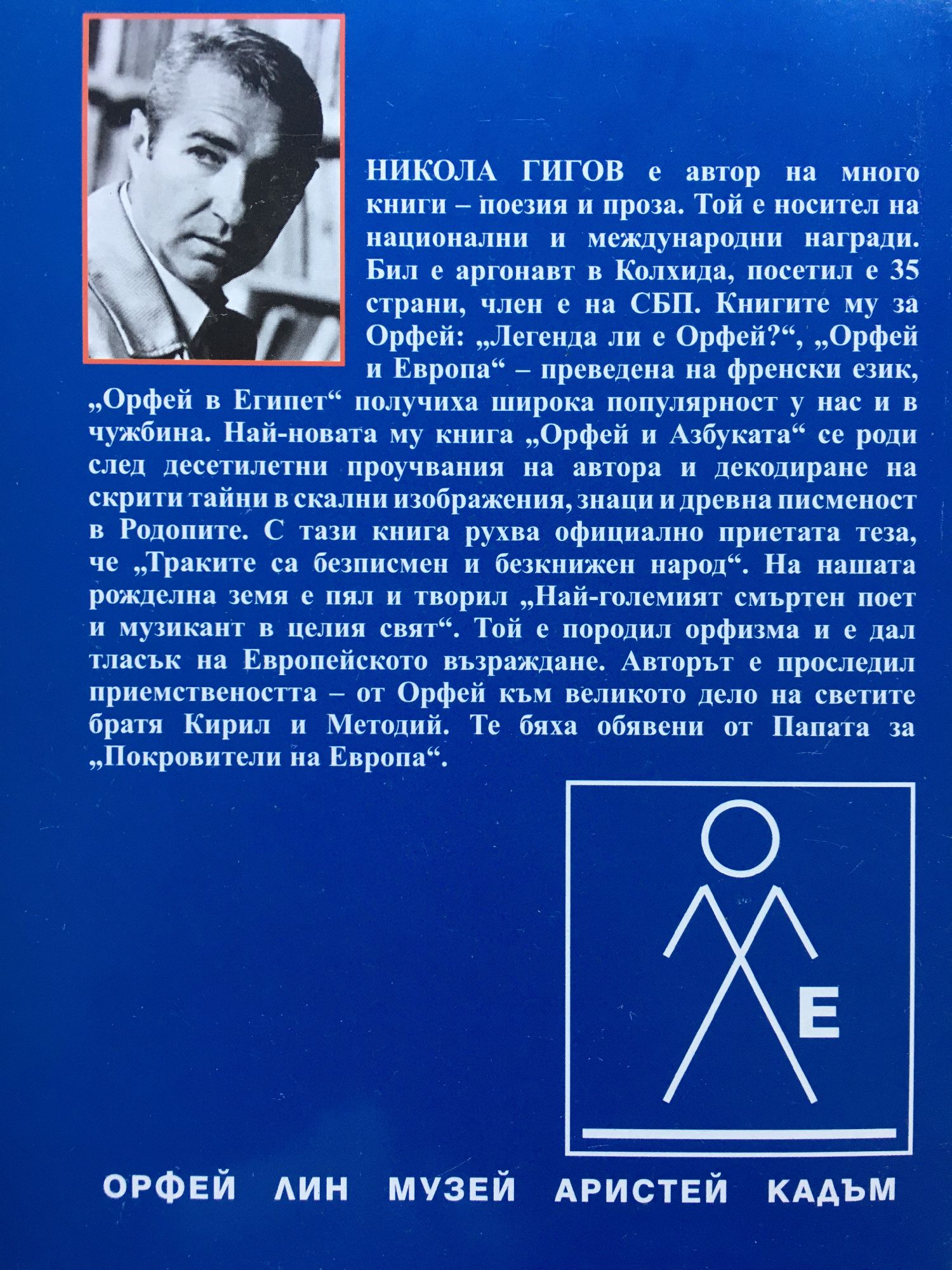 Никола Гигов е автор на много книги – поезия и проза. Той е носител на национални и международни награди. Бил е агронавт в Колхида, посетил е 35 страни, член е на СБП. Книгите му за Орфей получиха широка популярност у нас и в чужбина. Настоящата книга се роди след десетилетни проучвания на автора и декодиране на скрити тайни в скални изображения, знаци и древна писменост в Родопите. С тази книга рухва официално приетата теза, че траките са безписмен и безкнижен народ. На нашата рожделна земя е пял и творил най-големият смъртен поет и музикант по целия свят. Той е породил орфизма и е дал тласък на Европейското възраждане. Авторът е проследил приемствеността – от Орфей към великото дело на светите братя Кирил и Методий. Те бяха обявени от Папата за „Покровители на Европа“.