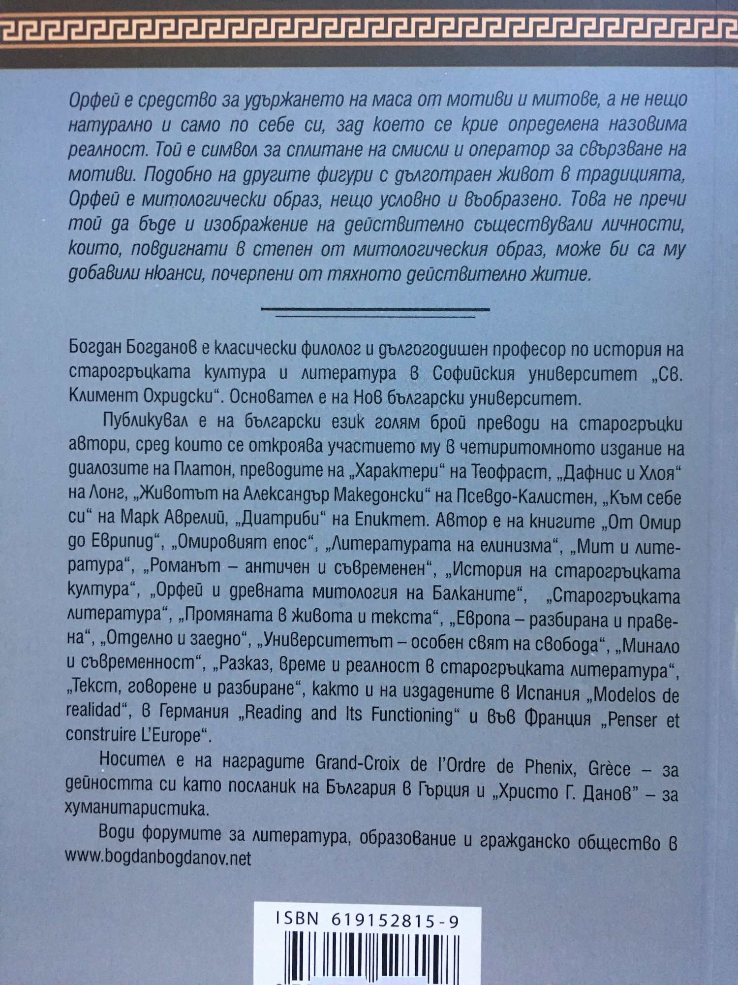 Орфей е средство за удържането на маса от мотиви и митове, а не нещо натурално и само по себе си, зад което се крие определена назовима реалност. Той е символ за сплитане на смисли и оператор за свързване на мотиви. Подобно на другите фигури с дълготраен живот в традицията, Орфей е митологически образ, нещо условно и въобразено. Това не пречи той да бъде и изображение на действително съществували личности, които, повдигнати в степен от митологическия образ, може би са му добавили нюанси, почерпени от тяхното действително житие. Богдан Богданов е класически филолог и дългогодишен професор по история на старогръцката култура и литература в Софийския университет „Св. Климент Охридски“. Основател е на Нов български университет. Публикувал е на български език голям брой преводи на старогръцки автори, сред които се откроява участието му в четиритомното издание на диалозите на Платон, преводите на „Характери“ на Теофраст, „Дафнис и Хлоя“ на Лонг, „Животът на Александър Македонски“ на Псевдо-Калистен, „Към себе си“ на Марк Аврелий, „Диатриби“ на Епиктет. Автор е на книгите „От Омир до Еврипид“, „Омировият епос“, „Литературата на елинизма“, „Мит и литература“, „Романът – античен и съвременен“, „История на старогръцката култура“, „Орфей и древната митология на Балканите“, „Старогръцката литература“, „Промяната в живота и текста“, „Европа – разбирана и правена“, „Отделно и заедно“, „Университетът – особен свят на свобода“, „Минало и съвременност“, „Разказ, време и реалност в старогръцката литература“, „Текст, говорене и разбиране“, както и на издадените в Испания „Modelos de realidad“, в Германия „Reading and Its Functioning“ и във Франция „Penser et construire L’Europe“. Носител е на наградите Grand-Croix de l’Ordre de Phenix, Gr?ce – за дейността си като посланик на България в Гърция и „Христо Г. Данов” – за хуманитаристика.