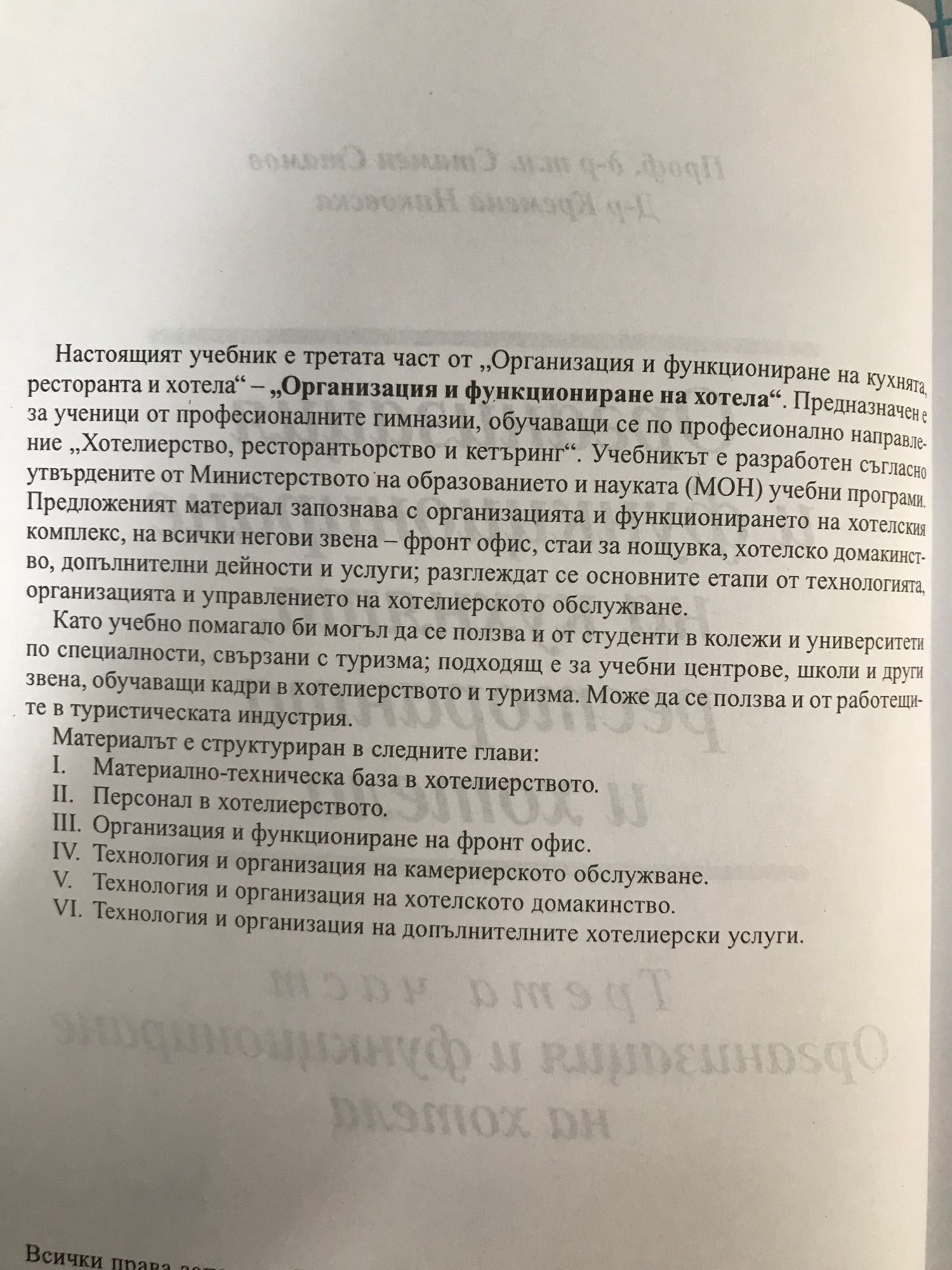 Настоящият учебник е третата част от "Организация и функциониране на кухнята, ресторанта и хотела". Предназначен е за ученици от професионалните гимназии, обучаващи се по професионално направление "Хотелиерство, ресторантьорство и кетъринг". Учебникът е разработен съгласно утвърдените от Министерството на образованието и науката (МОМН) учебни програми. Предложеният материал запознава с организацията и функционирането на хотелския комплекс, на всички негови звена - фронт офис, стаи за нощувка, хотелско домакинство, допълнителни дейности и услуги; разглеждат се основните етапи от технологията, организацията и управлението на хотелиерското обслужване.