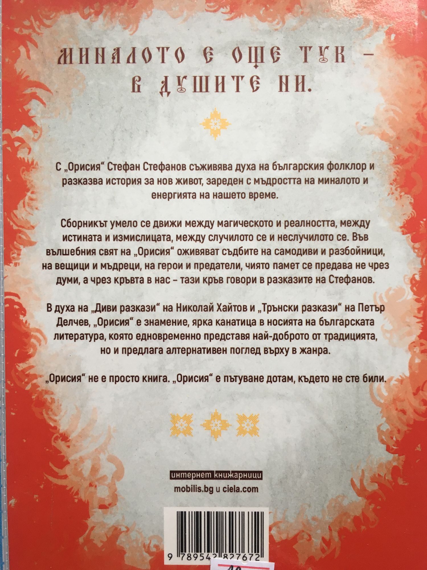 Миналото е още тук – в душите ни. С „Орисия“ Стефан Стефанов съживява духа на българският фолклор и разказва история за нов живот, зареден с мъдростта на миналото и енергията на нашето време. Сборникът умело се движи между магическото и реалността, между истината и измислицата, между случилото се и неслучилото се. Вълшебният свят на „Орисия“ разказва съдбите на самодиви и разбойници, на вещици и мъдреци, на герои и предатели, чиято памет се предава не чрез думи, а чрез кръвта в нас – на тази кръв говорят разказите на Стефанов. В духа на „Диви разкази” на Николай Хайтов и „Трънски разкази” на Петър Делчев „Орисия” е знамение, ярка „канатица” в носията на българската литература, която едновременно представя най-доброто от традицията, но и предлага алтернативен поглед върху в жанра. „Орисия“ не е просто книга. „Орисия“ е пътуване до там, където не сте били.