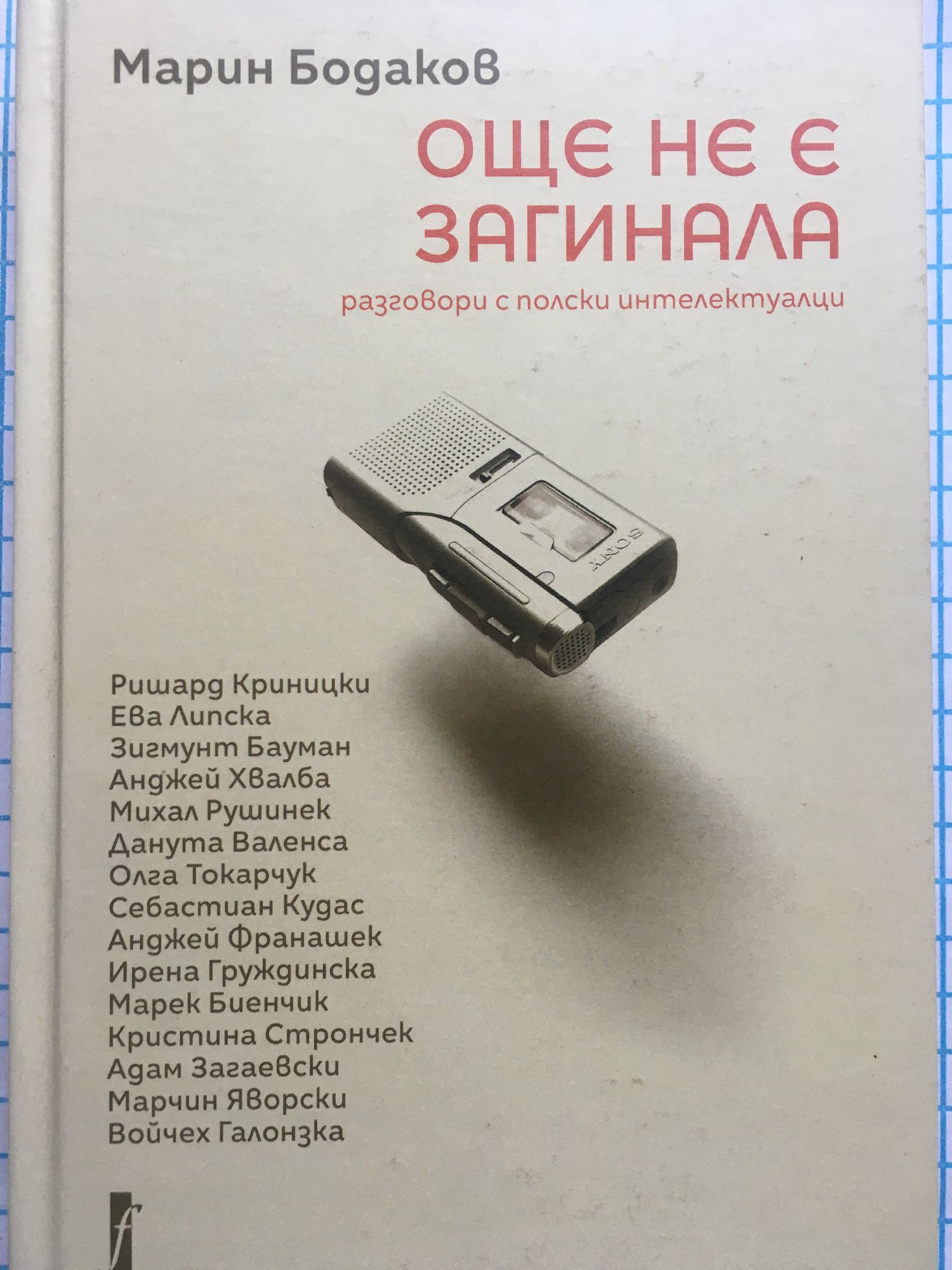 "Интересът на българската интелигенция към полската култура е отдавнашен и като че винаги е бил свързан с желанието за разчупване на традиционните схеми и отваряне към съвременното европейско изкуство - за какъвто и период да се отнася определението "съвременно". Настоящата книга на Марин Бодаков е подбор от разговори с гостували у нас интелектуалци по покана на Полския институт в периода между 2011 и 2019 година, и то изключително прецизен подбор. Направен е, от една страна, от автора, който бе не само утвърден поет, но и преподавател по критика и критически практики във Факултета по журналистика и масова комуникация на СУ "Св. Климент Охридски". От друга страна, това са интервюта, минали през цедката на вестник "Култура", наследен от в. "К", който в продължение на десетилетия беше синоним за високо интелектуално ниво в българската журналистика и до голяма степен определяше стандартите. Така чрез предложения сборник имаме възможност да се докоснем до най-добрите, поне до част от най-добрите съвременни полски творци, издавани в България. Разговаряйки, Бодаков не е пропуснал да потърси и българо-полски паралели. Оказва се, че в наши дни - както у нас, така и в Полша - никому не хрумва да разглежда поетите като знаменитости. Нещо повече, опростената парадигма на комуникация, съпътстваща нашенската чалгизация, се оказва и полско явление. Според литератора Марек Биенчик "там, където има редукция в езика, има и редукция в мисленето. Когато следим политическите дебати, виждаме как процесите се отразяват - и на очи се набива редукцията на понятия, на цели концепции". Нека тези прилики не ни утешават с идеята, че дефектите на българската съвременност се вписват в световни тенденции, защото и най-предубеденият читател, разлистил този сборник с интервюта, ще признае, че сравненията са възможни, но става дума за съвсем различни мащаби, а и за предупреждения, които все още не са станали свършен факт. Възниква въпросът: какво може да научи българският интелигент от тази колекция интервюта. Онова, което ми се струва най-важно, е: смирение. Защото е изправен пред славянска, но и глобална култура, в която поетите са високообразовани интелектуалци, а интелектуалците продължават да са будители на своя народ." проф. Правда Спасова В изданието ще намерите разговори с полските интелектуалци: Ришард Криницки; Ева Липска; Зигмунт Бауман; Анджей Хвалба; Михал Рушинек; Данута Валенса; Олга Токарчук; Себастиан Кудас; Анджей Франашек; Ирена Груждинска; Марек Биенчик; Кристина Стрончек; Адам Загаевски; Марчин Яворски; Войчех Галонзка.