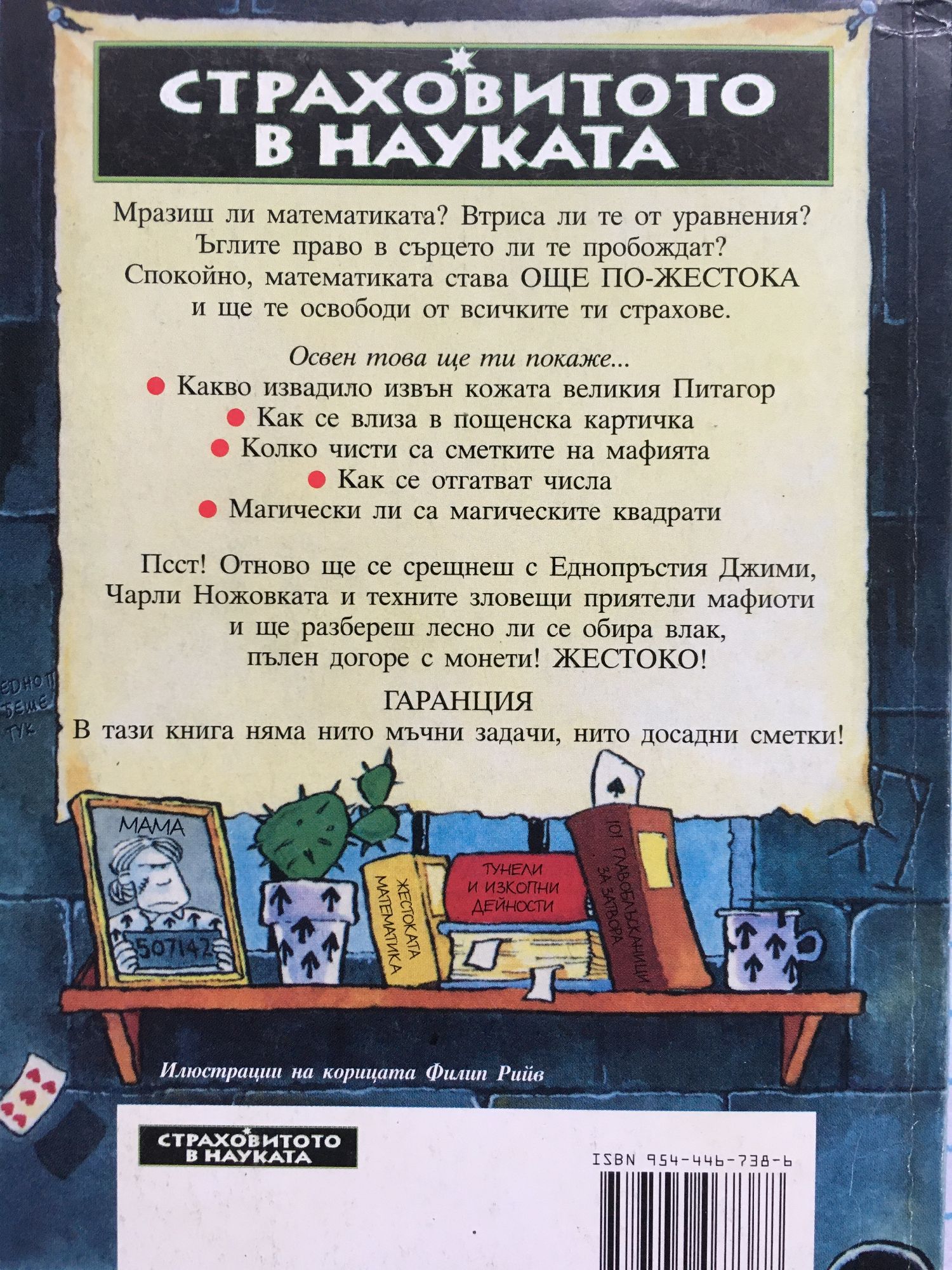 Мразиш ли математиката? Втриса ли те от уравнения? Ъглите право в сърцето ли те пробождат? Спокойно, математиката става ОЩЕ ПО-ЖЕСТОКА и ще те освободи от всичките ти страхове. Освен това ще ти покаже... * Какво извадило извън кожата великия Питагор * Как се влиза в пощенска картичка * Колко чисти са сметките на мафията * Как се отгатват числа * Магически ли са магическите квадрати. Псст! Отново ще се срещнеш с Еднопръстия Джими, Чарли Ножовката и техните зловещи приятели мафиоти и ще разбереш лесно ли се обира влак, пълен догоре с монети! ЖЕСТОКО! ГАРАНЦИЯ: В тази книга няма нито мъчни задачи, нито досадни сметки.