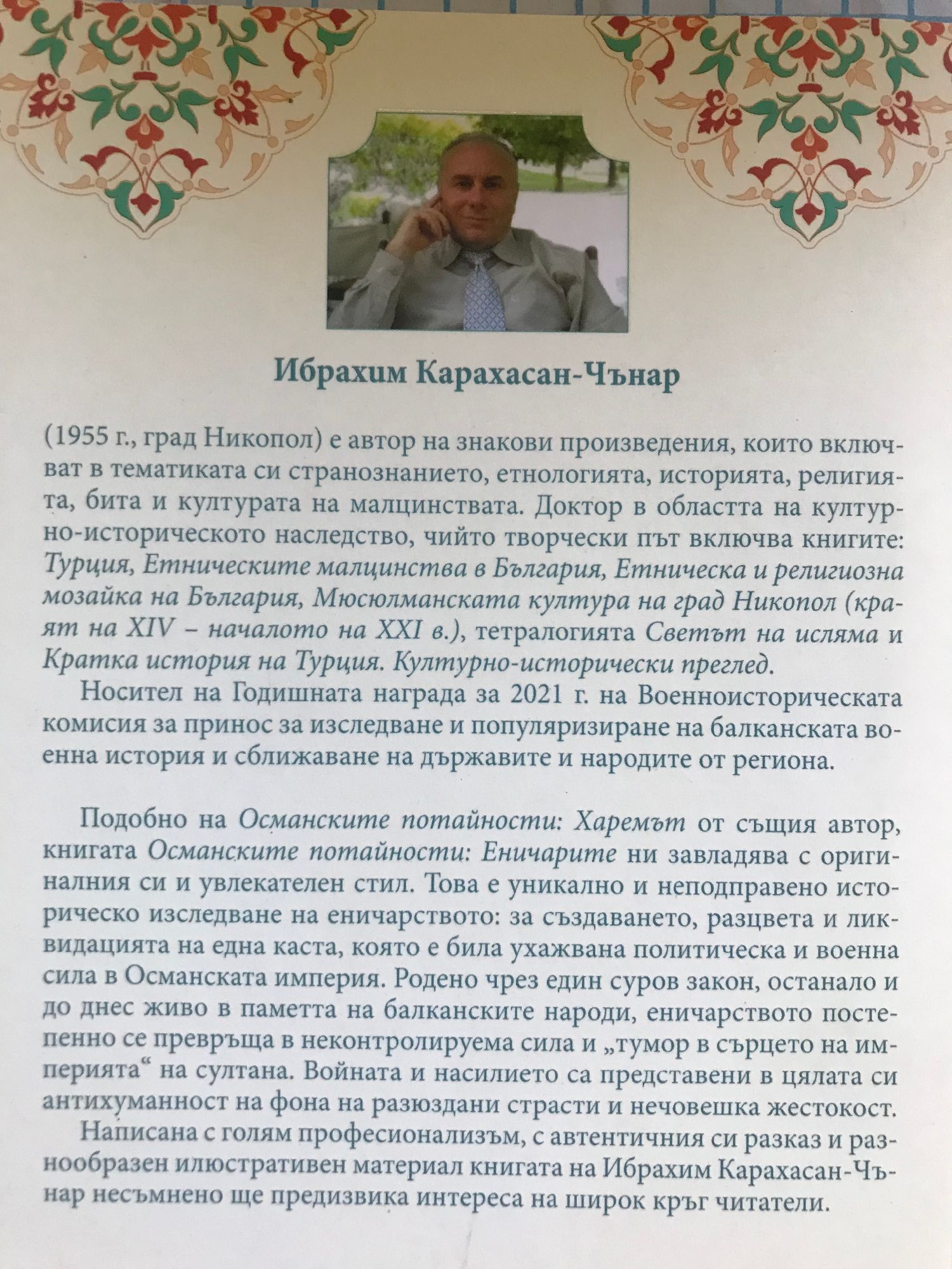 Подобно на Османските потайности: Харемът от същия автор, книгата Османските потайности: Еничарите ни завладява с оригиналния си и увлекателен стил. Това е уникално и неподправено историческо изследване на еничарството: за създаването, разцвета и ликвидацията на една каста, която е била ухажвана политическа и военна сила в Османската империя. Родено чрез един суров закон, останало и до днес живо в паметта на балканските народи, еничарството постепенно се превръща в неконтролируема сила и „тумор в сърцето на империята“ на султана. Войната и насилието са представени в цялата си антихуманност на фона на разюздани страсти и нечовешка жестокост. Написана с голям професионализъм, с автентичния си разказ и разнообразен илюстративен материал книгата на Ибрахим Карахасан-Чънар несъмнено ще предизвика интереса на широк кръг читатели.