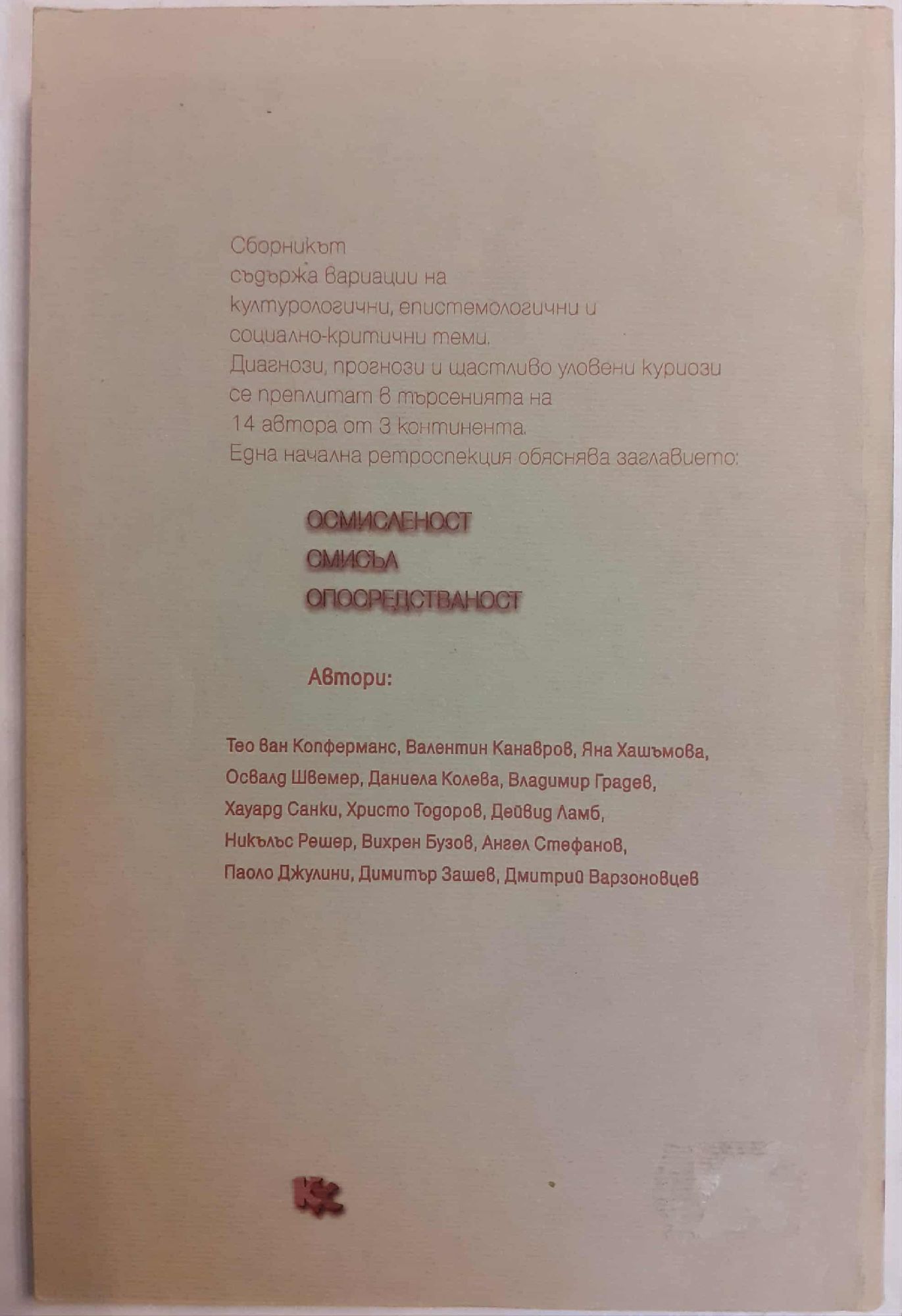 Сборникът съдържа вариации на културологични, епистемологични и социално-критични теми. Диагнози, прогнози и щастливо уловени куриози се преплитат в търсенията на 14 автора от 3 континента.