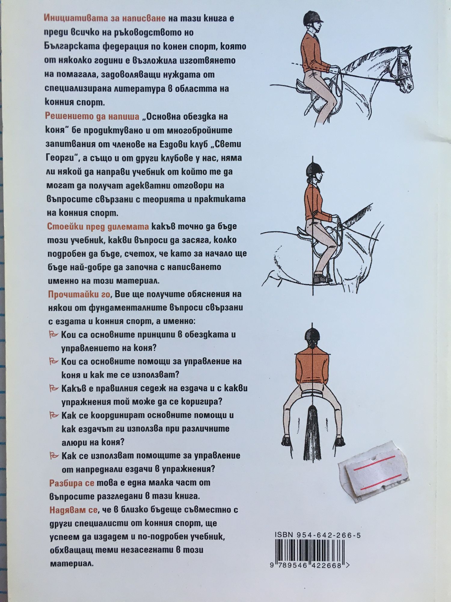 Инициативата за написване на тази книга е преди всичко на ръководството на Българската федерация по конен спорт, която от няколко години е възложила изготвянето на помагала, задоволяващи нуждата от специализирана литература в областта на конния спорт. Решението да напиша "Основна обездка на коня" бе продиктувано и от многобройните запитвания от членове на Ездови клуб "Свети Георги", а също и от други клубове у нас, няма ли някой да направи учебник от който те да могат да получат адекватни отговори на въпросите свързани с теорията и практиката на конния спорт. Стоейки пред дилемата какъв точно да бъде този учебник, какви въпроси да засяга, колко подробен да бъде, счетох, че като за начало ще бъде най-добре да започна с написването именно на този материал. Прочитайки го. Вие ще получите обяснения на някои от фундаменталните въпроси свързани с ездата и конния спорт, а именно: Кои са основните принципи в обездката и управлението на коня? Кои са основните помощи за управление на коня и как те се използват? Какъв е правилния седеж на ездача и с какви упражнения той може да се коригира? Как се координират основните помощи и как ездачът ги използва при различните алюри на коня? Как се използват помощите за управление от напреднали ездачи в упражнения? Разбира се това е една малка част от въпросите разгледани в тази кига. Надявам се, че в близко бъдеще съвместно с други специалисти от конния спорт, ще успеем да издадем и по-подробен учебник, обхващащ теми незасегнати в този материал.