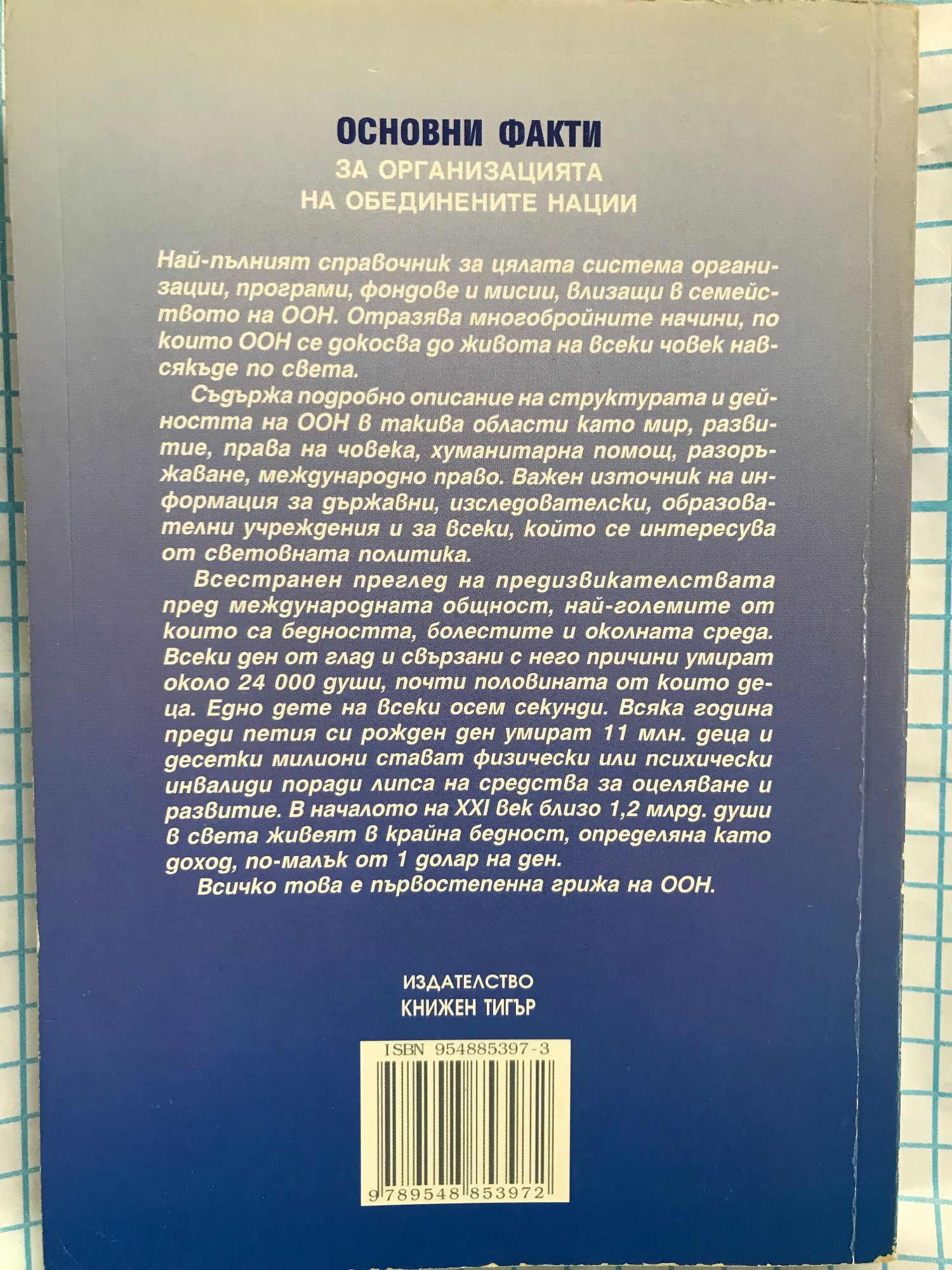 Най-пълният справочник за цялата система организации, програми, фондове и мисии, влизащи в семейството на ООН. Съдържа подробно описание на структурата и дейността на ООН в такива области като мир, развитие, права на човека, хуманитарна помощ, разоръжаване, международно право. Всестранен преглед на предизвикателствата пред международната общност, най-големите от които са бедността, болестите и околната среда.