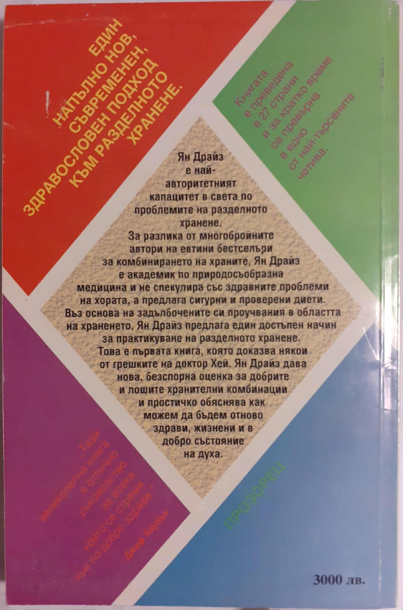 Един напълно нов подход към разделното хранене, системата за комбинирането на храните - в нейния най-съвършен вид, изчистена от грешките на д-р Хей. Ян Драйз е най-авторитетният капацитет в света по проблемите на разделното хранене. За разлика от многобройните автори на евтини бестселъри за комбинирането на храните Ян Драйз е академик по природосъобразна медицина и не спекулира със здравните проблеми на хората, а предлага сигурни и проверени диети. Въз основа на задълбочените си проучвания в областта на храненето Ян Драйз предлага един достъпен начин за практикуване на разделното хранене. Това е първата книга, която доказва някои от грешките на доктор Хей. Ян Драйз дава нова, безспорна оценка за добрите и лошите хранителни комбинации и простичко обяснява как можем да бъдем отново здрави, жизнени и в добро състояние на духа.