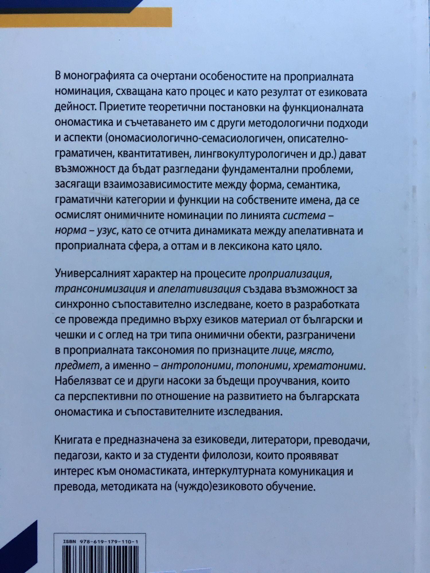В монографията са очертани особеностите на проприалната номинация, схващана като процес и като резултат от езиковата дейност. Приетите теоретични постановки на функционалната ономастика и съчетаването им с други методологични подходи и аспекти (ономасиологично-семасиологичен, описателно-граматичен, квантитативен, лингвокултурологичен и други) дават възможност да бъдат разгледани фундаментални проблеми, засягащи взаимозависимостите между форма, семантика, граматични категории и функции на собствените имена, да се осмислят онимичните номинации по линията система - норма - узус, като се отчита динамиката между апелативната и проприалната сфера, а оттам и в лексикона като цяло. Универсалният характер на процесите проприализация, трансонимизация и апелативизация създава възможност за синхронно съпоставително изследване, което в разработката се провежда предимно върху езиков материал от български и чешки и с оглед на три типа онимични обекти, разграничени в проприалната таксономия по признаците лице, място, предмет, а именно - антропоними, топоними, хрематоними. Набелязват се и други насоки за бъдещи проучвания, които са перспективни по отношение на развитието на българската ономастика и съпоставителните изследвания. Книгата е предназначена за езиковеди, литератори, преводачи, педагози, както и за студенти филолози, които проявяват интерес към ономастиката, интеркултурната комуникация и превода, методиката на (чуждо)езиковото обучение.