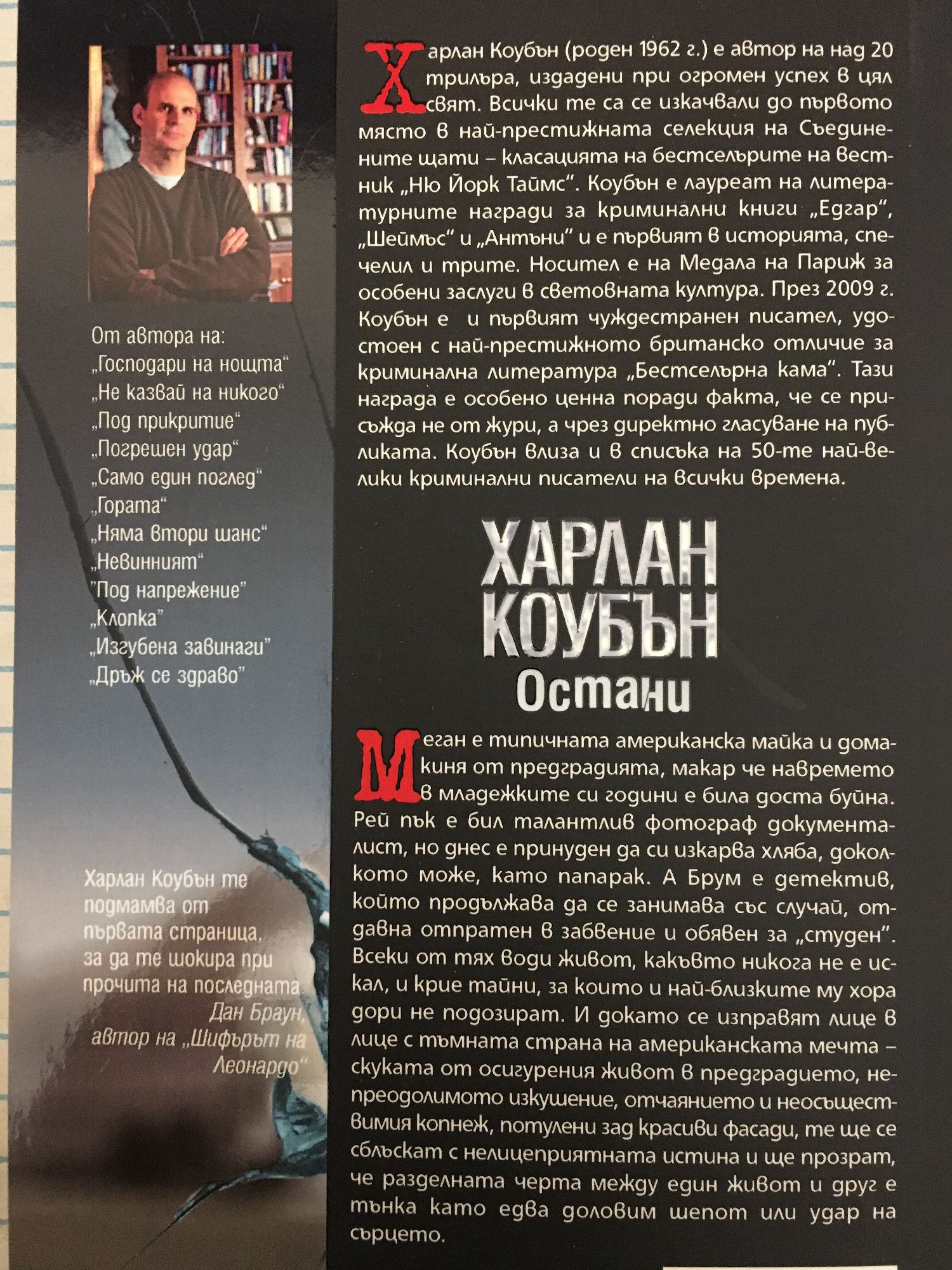 Меган е типичната американска майка и домакиня от предградията, макар че навремето в младежките си години е била доста буйна. Рей пък е бил талантлив фотограф документалист, но днес е принуден да си изкарва хляба, доколкото може, като папарак. А Брум е детектив, който продължава да се занимава със случай, отдавна отпратен в забвение и обявен за „студен”. Всеки от тях води живот, какъвто никога не е искал, и крие тайни, за които и най-близките му хора дори не подозират. И докато се изправят лице в лице с тъмната страна на американската мечта – скуката от осигурения живот в предградието, непреодолимото изкушение, отчаянието и неосъществимия копнеж, потулени зад красиви фасади, те ще се сблъскат с нелицеприятната истина и ще прозрат, че разделната черта между един живот и друг е тънка като едва доловим шепот или удар на сърцето. Харлан Коубън те подмамва от първата страница, за да те шокира при прочита на последната. Дан Браун, автор на „Шифърът на Леонардо“