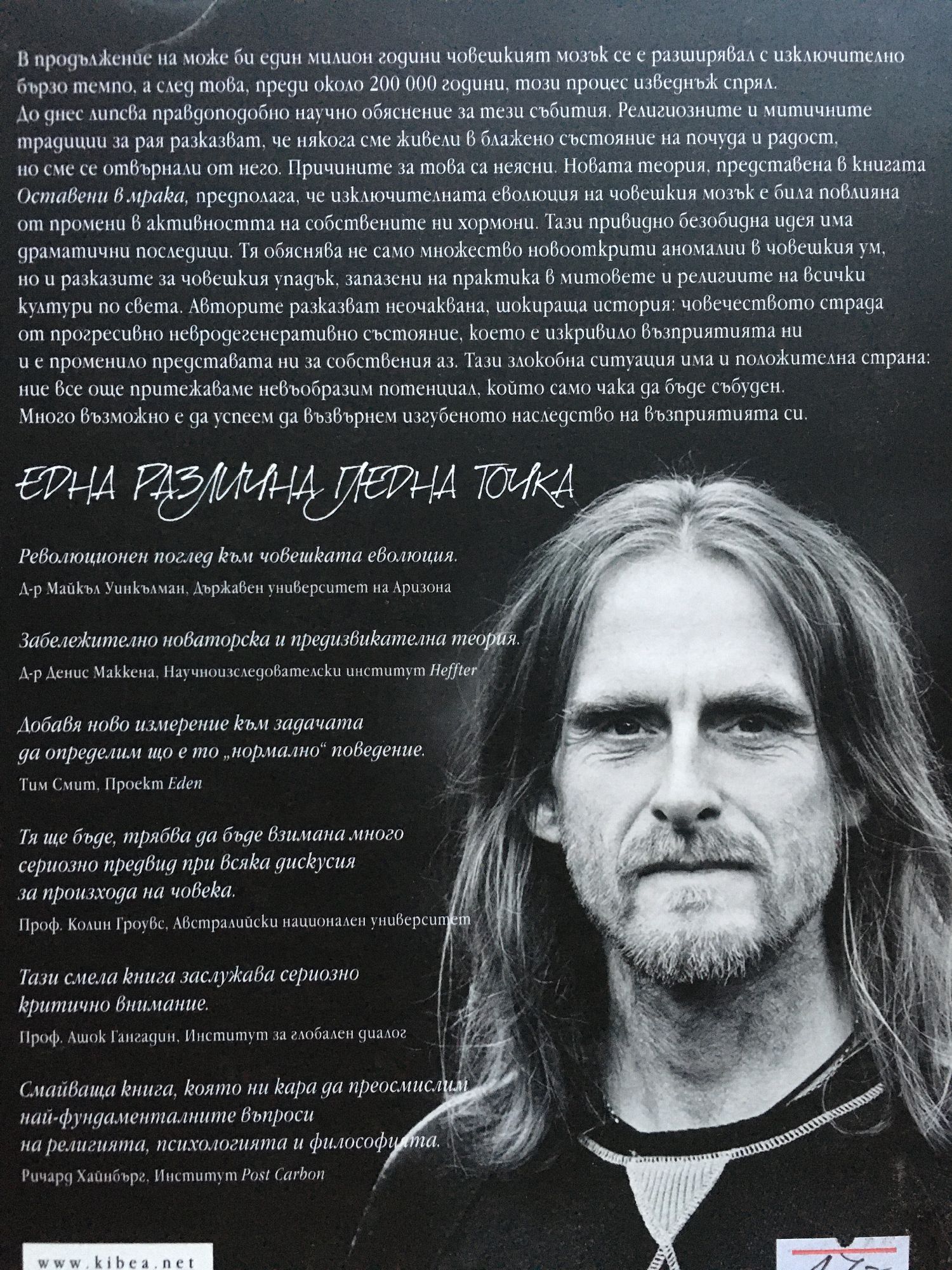 Прогонването от рая: биологичната история. Книгата "Оставени в мрака" предлага по оригинален и увлекателен начин напълно нов подход за възприемане на развитието и разделянето на мозъчните функции при човека между лявото и дясното полукълбо. Теорията изложена тук е изключително свежа, неочаквана и нова, така че най-вероятно ще отнеме доста време преди еволюционни антрополози и психолози да започват да я възприемат, но идеите в тази книга без съмнение ще окажат въздействие. Тя може и трябва да се вземе предвид в бъдеща дискусия за произхода и еволюцията на човека - споделя в свое изказване Колин Гроувс - професор по биологична антропология в Училището по археология и антропология към Австралийския национален университет и автор на няколко книги, включително "A Theory Of Human And Primate Evolution and Bones", "Stones and Molecules". Според него изложената теория е напълно нов поглед върху еволюцията на човешкия мозък. За Тони Райт Тони Райт е 42-годишен изследовател и автор от Великобритания - Пензанс, Корнуол. Участвал е в експерименти с продължително лишаване от сън (рекордът му е 11 денонощия без сън), като целта му е да установи как реагира човешкият организъм на лишаването от сън и какво се случва с функциите на човешкия мозък при подобно върхово натоварване. Неговите теории са получили подкрепа от различни изследователи в областта на неврологията, антропологията и психологията. Изследователи като Колин Гроувс, Денис Маккена, Роберт Грийнуей, както и много други, намират идеите му за интересни и заслужаващи внимание.