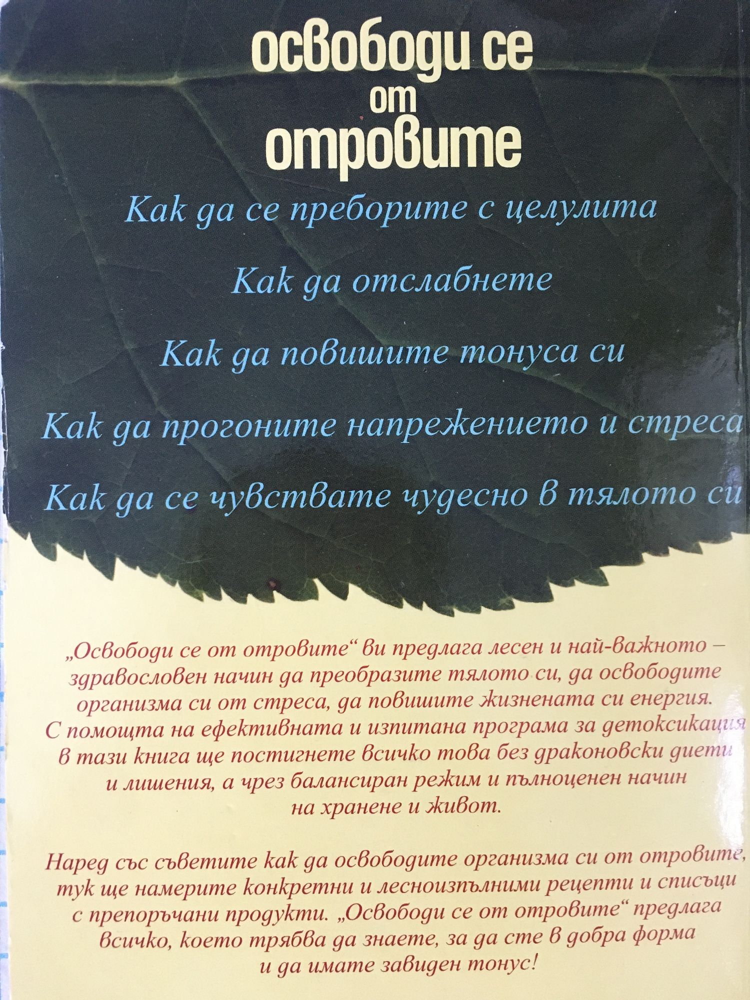 „Освободи се от отровите“ предлага лесен и най-важното – здравословен начин да преобразите тялото си, да освободите организма си от стреса, да повишите жизнената си енергия. Тя ще ви помогне да се преборите с ужасния целулит, да отслабнете, но да запазите тонуса си и да се чувствате чудесно в новото си тяло без токсини. С помощта на ефективната и изпитана програма за детоксикация на Джейн Скривнър, диетолог с дългогодишна практика, ще постигнете всичко това без драстични диети и лишения, а чрез балансиран режим и пълноценен начин на хранене и живот. Програмата за детоксификация на Скривнър се изпълнява в рамките на 30 дни, като първите резултати са налице само след седмица и води не само до подмладяване на тялото, но и до увеличаване на имунната защита на организма. Наред със съветите как да освободите организма си от отровите, тук ще намерите и конкретни и лесноизпълними рецепти, списъци с препоръчителни продукти, система от ежедневни физически упражнения, както и комбинация от спомагателни дейности като почистване на кожата, контрастни душове, масажи, дихателни упражнения и други ценни съвети за здравословно пречистване и енергизиране на тялото. „Освободи се от отровите” предлага всичко, което трябва да знаете, за да сте в добра форма и да имате завиден тонус.