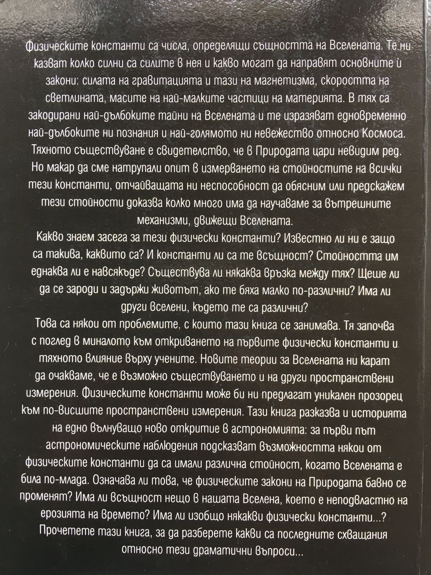 Физическите константи са числа, определящи същността на Вселената. Те ни казват колко силни са силите в нея и какво могат да направят основните й закони: силата на гравитацията и тази на магнетизма, скоростта на светлината, масите на най-малките частици на материята. В тях са закодирани най-дълбоките тайни на Вселената и те изразяват едновременно най-дълбоките ни познания и най-голямото ни невежество относно Космоса. Тяхното съществуване е свидетелство, че в Природата цари невидим ред. Но макар да сме натрупали опит в измерването на стойностите на всички тези константи, отчайващата ни неспособност да обясним или предскажем тези стойности доказва колко много има да научаваме за вътрешните механизми, движещи Вселената. Какво знаем засега за тези физически константи? Известно ли ни е защо са такива, каквито са? И константи ли са те всъщност? Стойността им еднаква ли е навсякъде? Съществува ли някаква връзка между тях? Щеше ли да се зароди и задържи животът, ако те бяха малко по-различни? Има ли други вселени, където те са различни? Това са някои от проблемите, с които тази книга се занимава. Тя започва с поглед в миналото към откриването на първите физически константи и тяхното влияние върху учените. Новите теории за Вселената ни карат да очакваме, че е възможно съществуването и на други пространствени измерения. Физическите константи може би ни предлагат уникален прозорец към по-висшите пространствени измерения. Тази книга разказва и историята на едно вълнуващо ново откритие в астрономията: за първи път астрономическите наблюдения подсказват възможността някои от физическите константи да са имали различна стойност, когато Вселената е била по-млада. Означава ли това, че физическите закони на Природата бавно се променят? Има ли всъщност нещо във нашата Вселена, което е неподвластно на ерозията на времето? Има ли изобщо някакви физически константи...? Прочетете тази книга, за да разберете какви са последните схващания относно тези драматични въпроси...