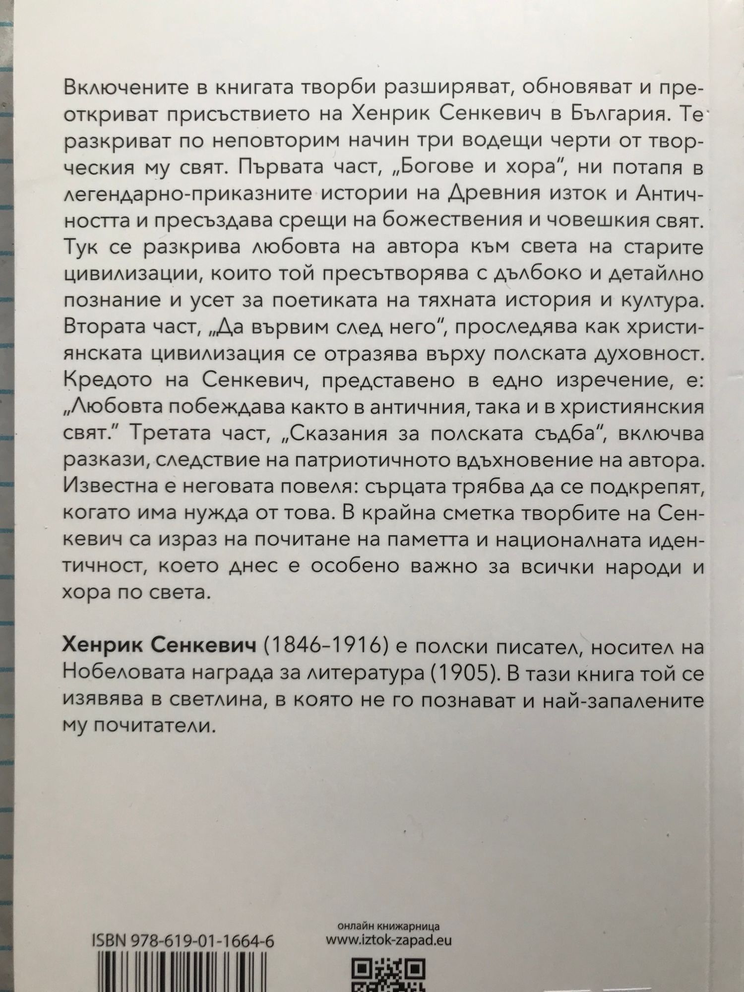 Включените в книгата творби разширяват, обновяват и преоткриват присъствието на Хенрик Сенкевич в България. Те разкриват по неповторим начин три водещи черти от творческия му свят. Първата част, „Богове и хора“, ни потапя в легендарно-приказните истории на Древния изток и Античността и пресъздава срещи на божествения и човешкия свят. Тук се разкрива любовта на автора към света на старите цивилизации, които той пресътворява с дълбоко и детайлно познание и усет за поетиката на тяхната история и култура. Втората част, „Да вървим след него“, проследява как християнската цивилизация се отразява върху полската духовност. Кредото на Сенкевич, представено в едно изречение, е: „Любовта побеждава както в античния, така и в християнския свят.“ Третата част, „Сказания за полската съдба“, включва разкази, следствие на патриотичното вдъхновение на автора. Известна е неговата повеля: сърцата трябва да се подкрепят, когато има нужда от това. В крайна сметка творбите на Сенкевич са израз на почитане на паметта и националната идентичност, което днес е особено важно за всички народи и хора по света.