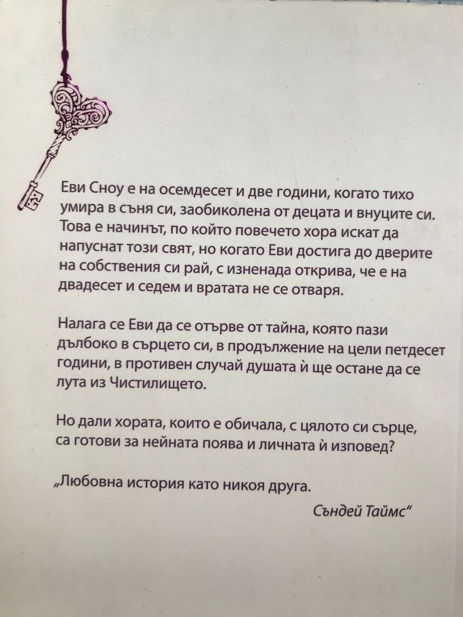 Еви Сноу е на осемдесет и две, когато тихо умира в съня си, заобиколена от децата и внуците си. Това е начинът, по който повечето хора искат да напуснат света, но когато Еви достига до вратата на собствения си рай, тя открива, че отново е на двадесет и седем години, а вратата й не се отваря.