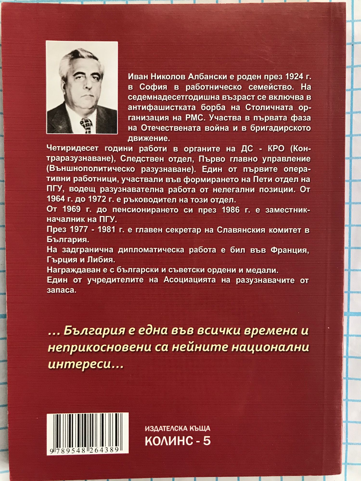 Иван Николов Албански е роден през 1924 г. в София в работническо семейство. На 17 годишна възраст се включва в антифашистката борба. Участва в първата фаза на Отечествената война и в бригадирското движение. Четиридесет години работи в органите на ДС - контраразузнаване, Следствен отдел, Първо главно управление. Един от първите оперативни работници, участвали във формирането на Пети отдел на ПГУ, водещ разузнавателна работа от нелегални позициии. От 1964 г. до 1972 г.е ръководител на този отдел. От 1969 г. до пенсионирането си е заместник-началник на ПГУ. През 1977-1981 г. е главен секретар на Славянския комитет в България. На задгранична дипломатическа работа е бил във Франция, Гърция и Либия. Награждаван е с български и съветски ордени и медали. Един от учредителите на Асоциацията на разузнавачите от запаса.