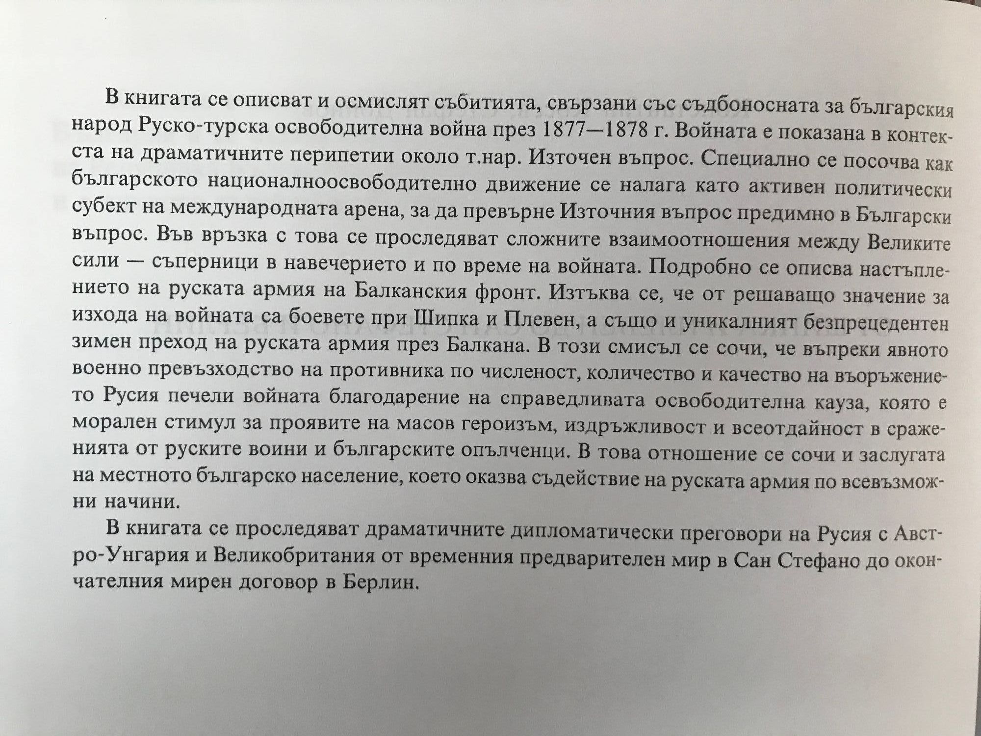В книгата се описват и осмислят събитията, свързани със съдбоносната за българския народ Руско-турска освободителна война през 1877-1878 г. Войната е показана в контекста на драматичните перипетии около т. нар. Източен въпрос. Специално се посочва как българското националноосвободително движение се налага като активен политически субект на международната арена, за да превърне Източния въпрос предимно в Български въпрос. Във връзка с това се проследяват сложните взаимоотношения между Великите сили - съперници в навечерието и по време на войната. Подробно се описва настъплението на руската армия на Балканския фронт. В книгата се проследяват драматичните дипломатически преговори на Русия с Австро-Унгария и Великобритания от временния предварителен мир в Сан Стефано до окончателния мирен договор в Берлин.