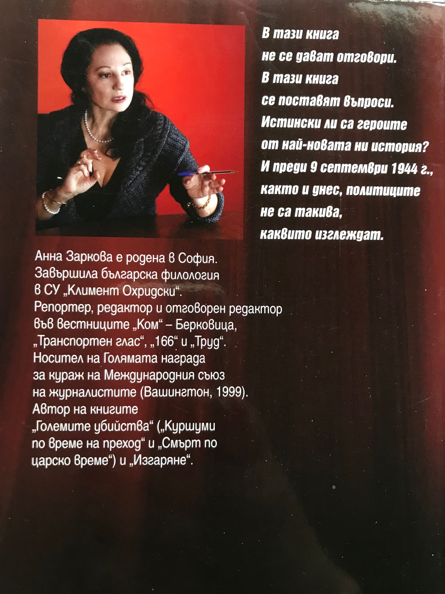 В тази книга не се дават отговори. В тази книга се поставят въпроси. Истински ли са героите от най-новата ни история? И преди 9 септември 1944 г., както и днес, политиците не са такива, каквито изглеждат. Анна Заркова е родена в София. Завършила е българска филология в СУ "Климент Охридски". Репортер, редактор и отговорен редактор във вестниците "Соч" - Берковица, "Транспортен глас", "166" и "Труд". Носител на голямата награда за кураж на Международния съюз на журналистите /Вашингтон, 1999/.