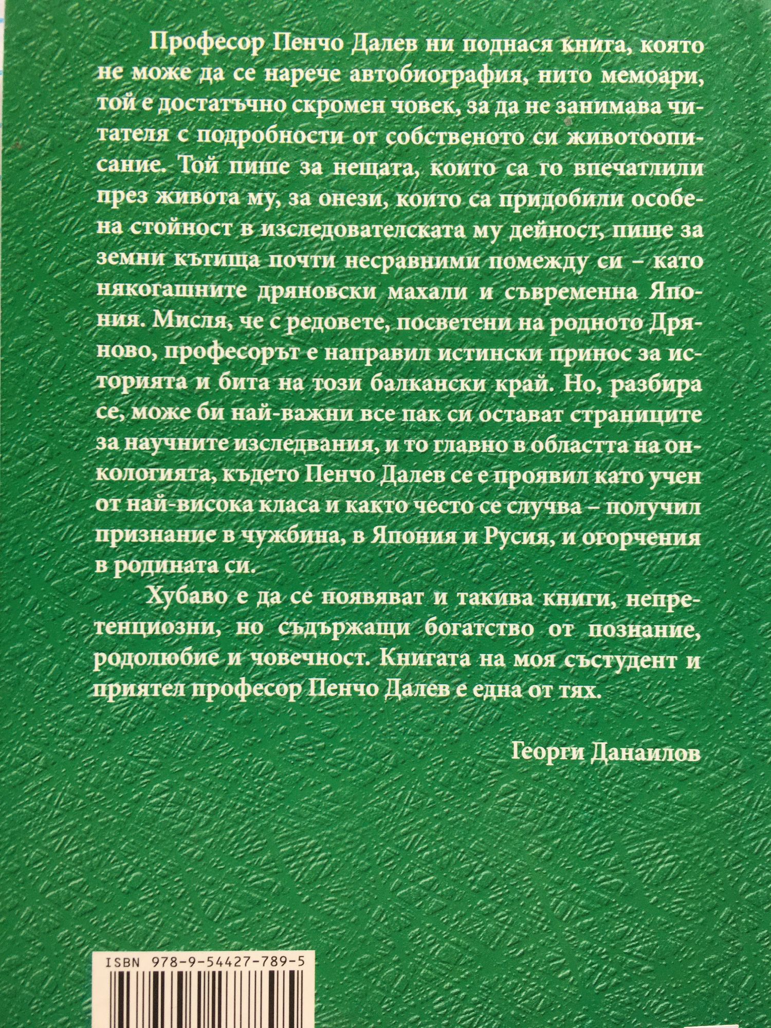 Професор Пенчо Далев ни поднася книга, която не може да се нарече автобиография, нито мемоари, той е достатъчно скромен човек, за да не занимава читателя с подробности от собственото си животоописание. Той пише за нещата, който са го впечатлили през живота му, за онези, които са придобили особена стойност в изследователската му дейност, пише за земни кътища почти несравними помежду си - като някогашните дряновски махали и съвременна Япония. Мисля, че с редовете, посветени на родното Дряново, професорът е направил истински принос за историята и бита на този балкански край. Но, разбира се, може би най-важни все пак си остават страниците за научните изследвания, и то главно в областта на онкологията, където Пенчо Далев се е проявил като учен от най-висока класа и както често се случва -получил признание в чужбина, в Япония и Русия, и огорчения в родината си. Хубаво е да се появяват и такива книги, непретенциозни, но съдържащи богатство от познание, родолюбие и човечност. Книгата на моя състудент и приятел професор Пенчо Далев е една от тях. Георги Данаилов