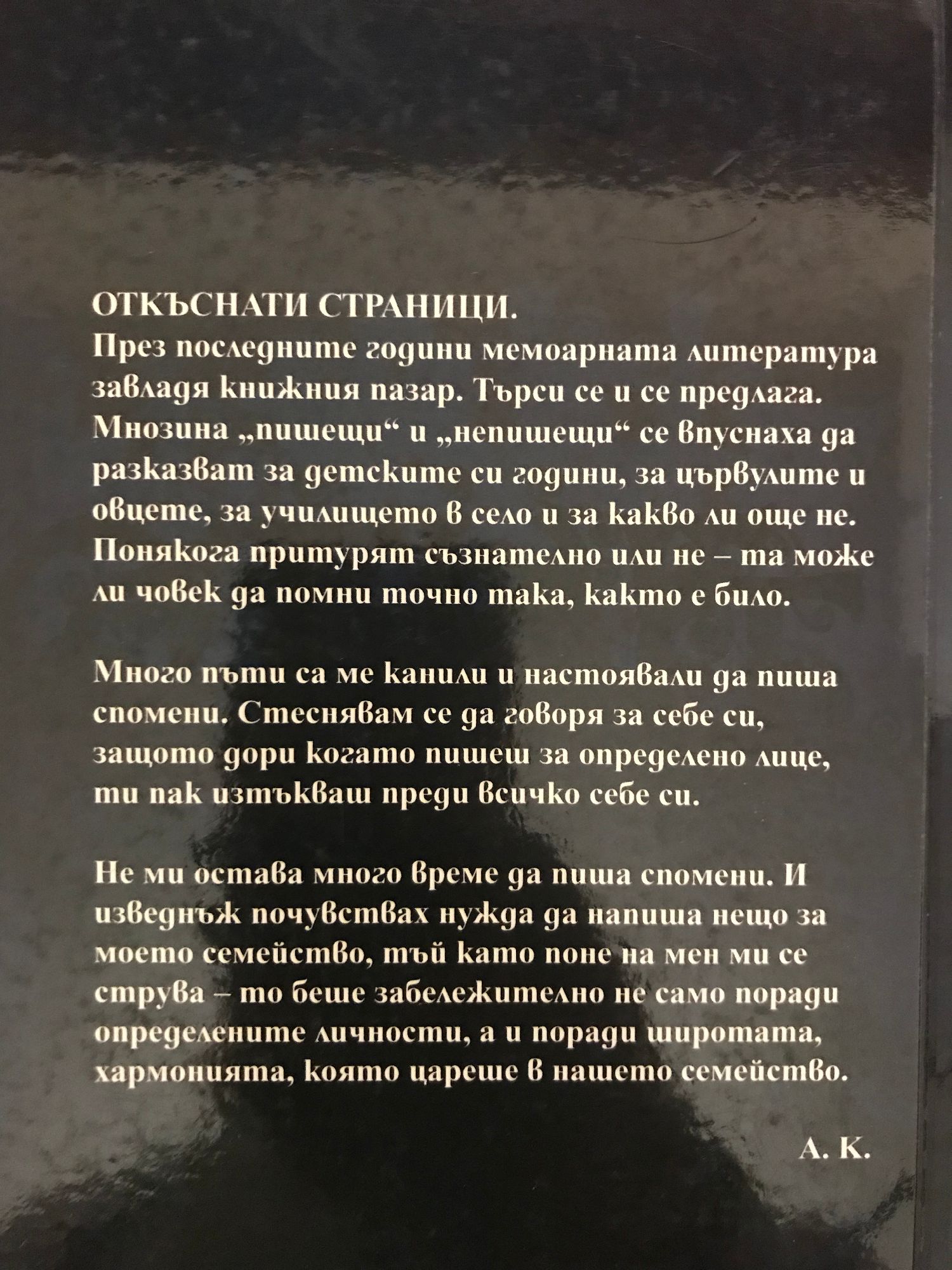ОТКЪСНАТИ СТРАНИЦИ. През последните години мемоарната литература завладя книжния пазар. Търси се и се предлага. Мнозина „пишещи" и „непишещи" се впуснаха да разказват за детските си години, за цървулите и овцете, за училището в село и за какво ли още не. Понякога притурят съзнателно или не - та може ли човек да помни точно така, както е било. Много пъти са ме канили и настоявали да пиша спомени. Стеснявам се да говоря за себе си, защото дори когато пишеш за определено лице, ти пак изтъкваш преди всичко себе си. Не ми остава много време да пиша спомени. И изведнъж почувствах нужда да напиша нещо за моето семейство, тъй като поне на мен ми се струва - то беше забележително не само поради определените личности, а и поради широтата, хармонията, която цареше в нашето семейство. A.K.