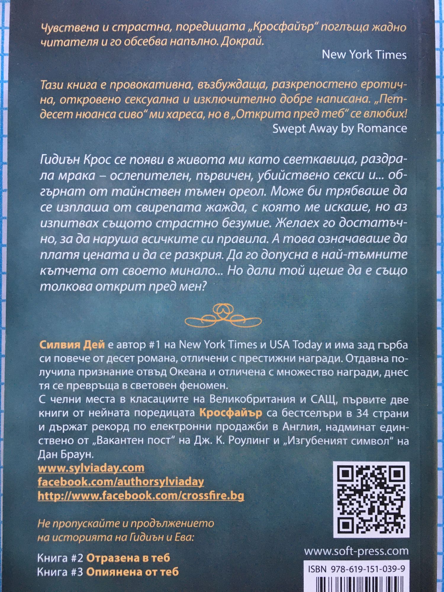 Книга #1 от попкултурната сензация на годината – поредицата КРОСФАЙЪР Чувствена и страстна, поредицата „Кросфайър“ поглъща жадно читателя и го обсебва напълно. Докрай. - New York Times Тази книга е провокативна, възбуждаща, разкрепостено еротична, откровено сексуална и изключително добре написана. „Петдесет нюанса сиво“ ми хареса, но в „Открита пред теб“ се влюбих! - Swept Away by Romance Гидиън Крос се появи в живота ми като светкавица, раздрала мрака – ослепителен, първичен, убийствено секси и... обгърнат от тайнствен тъмен ореол. Може би трябваше да се изплаша от свирепата жажда, с която ме искаше, но аз изпитвах същото страстно безумие. Желаех го достатъчно, за да наруша всичките си правила. А това означаваше да платя цената и да се разкрия. Да го допусна в най-тъмните кътчета от своето минало... Но дали той щеше да е също толкова открит пред мен? Силвия Дей e автор #1 на New York Times и USA Today и има зад гърба си повече от десет романа, отличени с престижни награди. Отдавна получила признание отвъд Океана, днес тя се превръща в световен феномен. С челни места в класациите на Великобритания и САЩ, първите две книги от нейната поредицата Кросфайър са бестселъри в 34 страни и държат рекорд по електронни продажби в Англия, надминат единствено от „Вакантен пост“ на Дж. К. Роулинг и „Изгубеният символ“ на Дан Браун. http://www.sylviaday.com/ https://www.facebook.com/AuthorSylviaDay http://www.facebook.com/crossfire.bg Не пропускайте и продължението на историята на Гидиън и Ева: Книга #2 Отразена в теб Книга #3 Опиянена от теб