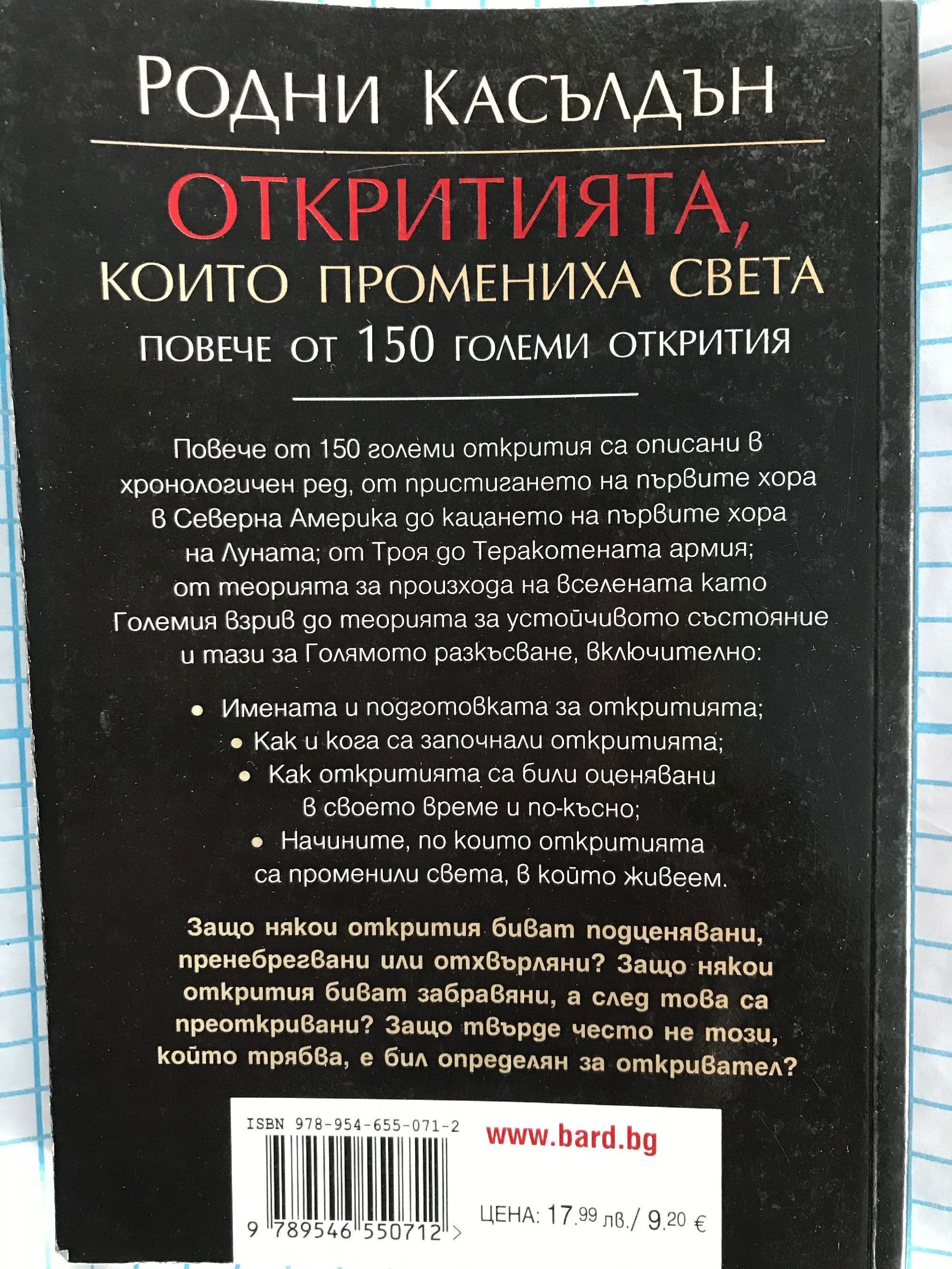 Специална поредица от големи открития и ролята им при промяната на хода на историята... Повече от 150 големи открития са описани в хронологичен ред, от пристигането на първите хора в Северна Америка до кацането на първите хора на Луната; от Троя до Теракотената армия; от теорията за произхода на вселената като Големия взрив до теорията за устойчивото състояние и тази за Голямото разкъсване, включително: • Имената и подготовката за откритията; • Как и кога са започнали откритията; • Как откритията са били оценявани в своето време и по-късно; • Начините, по които откритията са променили света, в който живеем. Защо някои открития биват подценявани, пренебрегвани или отхвърляни? Защо някои открития биват забравяни, а след това са преоткривани? Защо твърде често не този, който трябва, е бил определян за откривател?