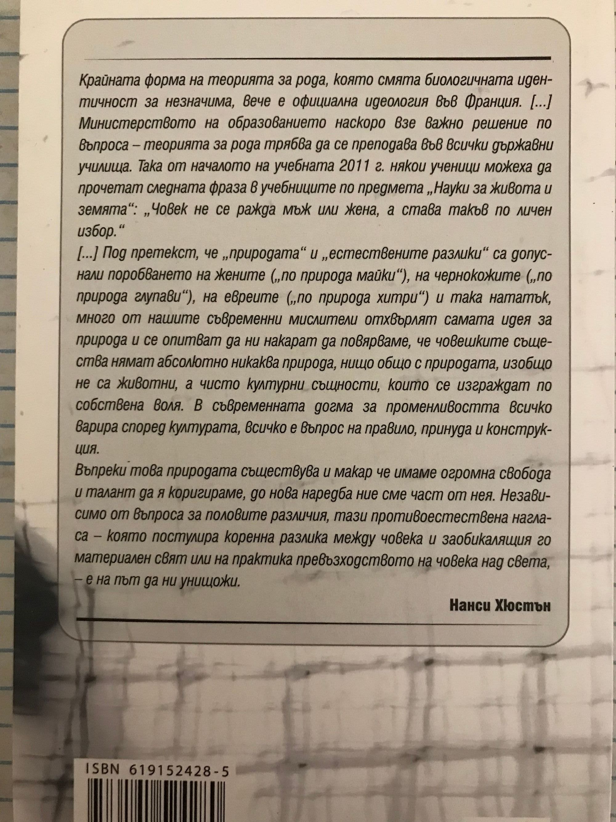 Крайната форма на теорията за рода, която смята биологичната идентичност за незначима, вече е официална идеология във Франция. [...] Министерството на образованието наскоро взе важно решение по въпроса – теорията за рода трябва да се преподава във всички държавни училища. Така от началото на учебната 2011 г. някои ученици можеха да прочетат следната фраза в учебниците по предмета „Науки за живота и земята“: „Човек не се ражда мъж или жена, а става такъв по личен избор.“ [...] Под претекст, че „природата“ и „естествените разлики“ са допуснали поробването на жените („по природа майки“), на чернокожите („по природа глупави“), на евреите („по природа хитри“) и така нататък, много от нашите съвременни мислители отхвърлят самата идея за природа и се опитват да ни накарат да повярваме, че човешките същества нямат абсолютно никаква природа, нищо общо с природата, изобщо не са животни, а чисто културни същности, които се изграждат по собствена воля. В съвременната догма за променливостта всичко варира според културата, всичко е въпрос на правило, принуда и конструкция. Въпреки това природата съществува и макар че имаме огромна свобода и талант да я коригираме, до нова наредба ние сме част от нея. Независимо от въпроса за половите различия, тази противоестествена нагласа – която постулира коренна разлика между човека и заобикалящия го материален свят или на практика превъзходството на човека над света, – е на път да ни унищожи. Нанси Хюстън