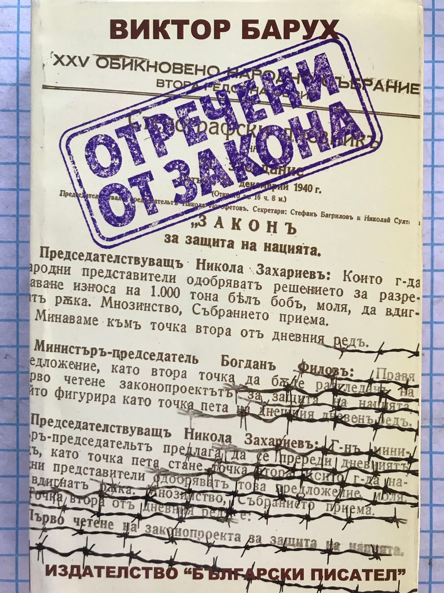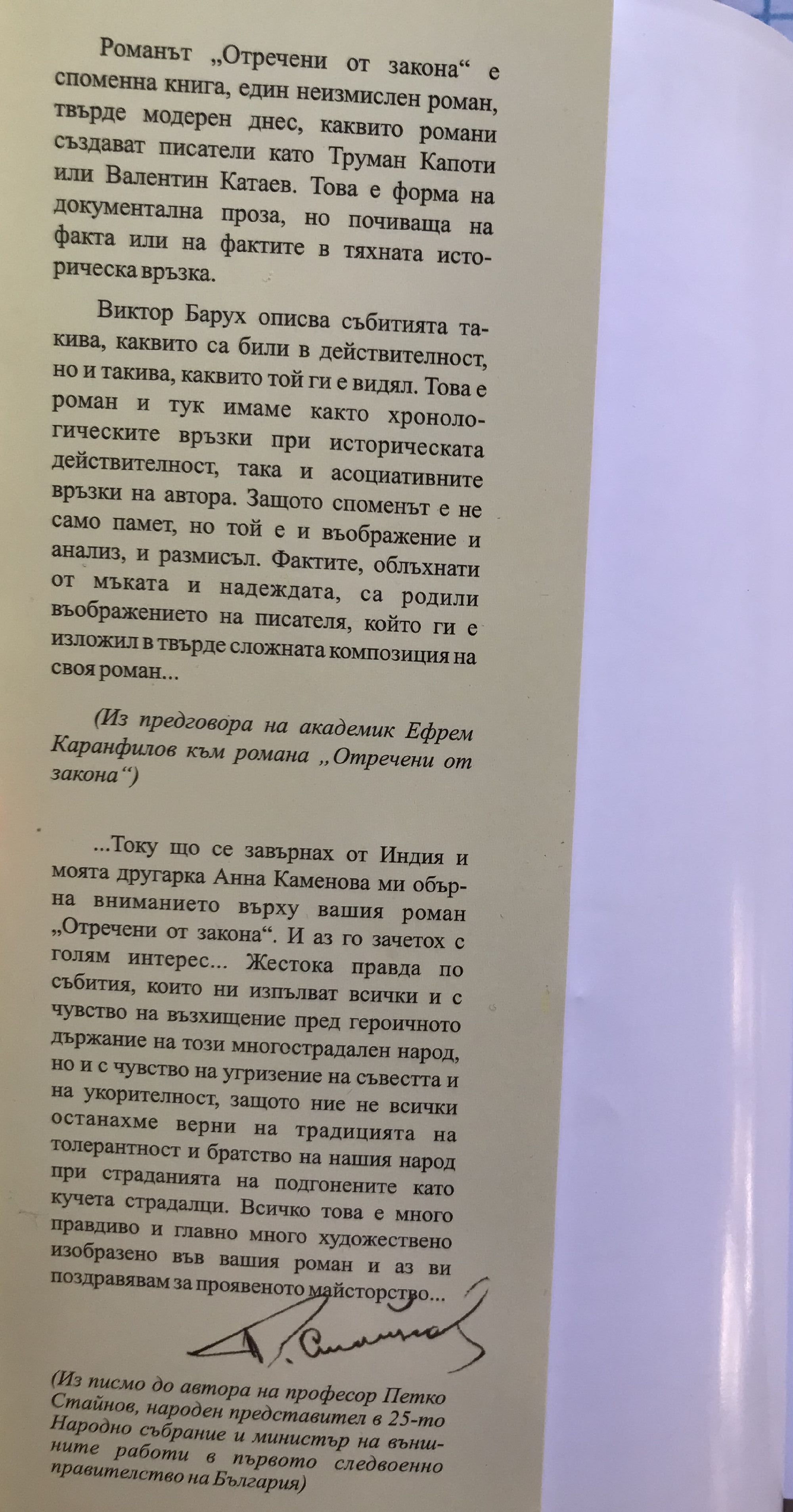 Романът на Виктор Барух "Отречени от закона" е роман за живота на евреите в Родината ни през времето на Втората световна война. Те тогава бяха не само отречени от закона, не само подложени на най-тежки изпитания, но се подготвяше и тяхното физическо изтребление. Всеки евреин е живял непрекъснато с мисълта за идващата и чаканата смърт. И той се борел да оцелее. Евреинът Виктор Барух заедно със семейството си е изживял тези кошмарни години, които са оставили завинаги неизлечима рана в душата му. Романът "Отречени от закона" е споменна книга, един не измислен роман, твърде модерен днес, каквито романи създават писатели като Труман Капоти или Валентин Катаев. Това е форма на документална проза, но почиваща на факта или на фактите в тяхната историческа връзка. Виктор Барух описва събитията такива, каквито са били в действителност, но и такива, каквито той ги е видял. Това е роман и тук имаме както хронологическите връзки при историческата действителност, така и асоциативните връзки на автора. Защото споменът е не само памет, но той е и въображение, и анализ, и размисъл. Фактите, облъхнати от мъката и надеждата, са родили въображението на писателя, който ги е изложил в твърде сложната композиция на своя роман. И още нещо — когато фактите преминат през душата на твореца, те отново разцъфтяват и започват да излъчват своя аромат. Виктор Барух умее да разказва пестеливо и да страда, да съчувства на страдащите, да вярва в идващите по-щастливи дни. И да кара нас читателите да изживяваме това тревожно и тежко време. Тук не са важни само историческите лица, които населяват романа като министри, депутати, хитлеристки фюрери, някои от крито разпознаваме, от цар Борис до комисаря по еврейските въпроси Белев, но и онези безименни герои, които се борят и загиват геройски. И накрая: романът на Виктор Барух "Отречени от закона", пресъздал това героично и трагично време, ни кара нас българите да се гордеем, че сме помогнали в една или друга степен да оцелеят българските евреи и да запазят завинаги скъп и хубав спомен за нашата Родина Ефрем Карамфилов