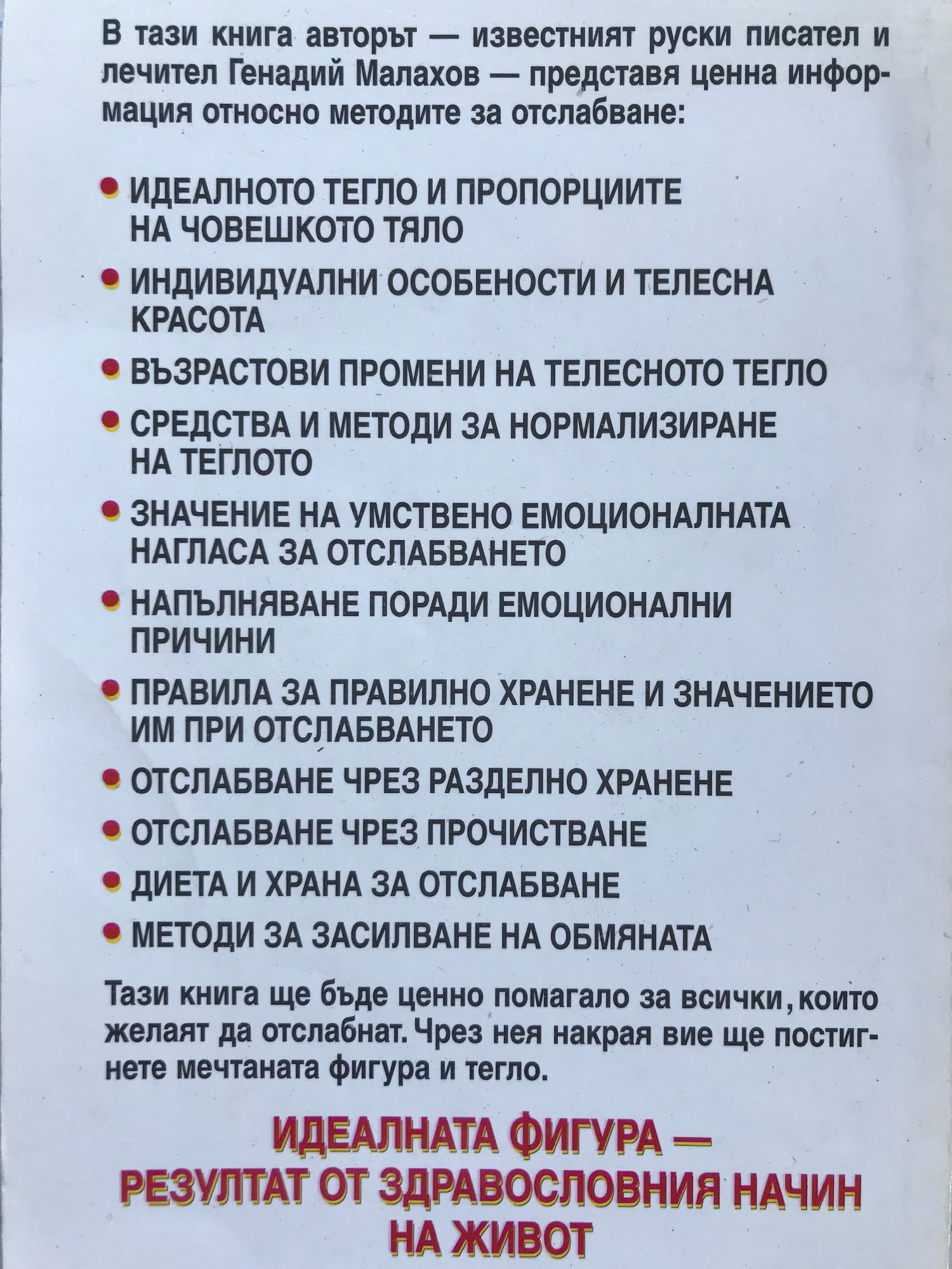 В тази книга авторът – известният руски писател и лечител Генадий Малахов – представя ценна информация относно методите на отслабване: - идеалното тегло и пропорциите на човешкото тяло - индивидуални особености и телесна красота - възрастови промени на телесното тегло - средства и методи за нормализиране на теглото - значение на умствено емоционалната нагласа за отслабване - напълняване поради емоционални причини - правила за правилно хранене и значението им при отслабването - отслабване чрез разделно хранене - отслабване чрез прочистване - диета и храна за отслабване - методи за засилване на обмяната