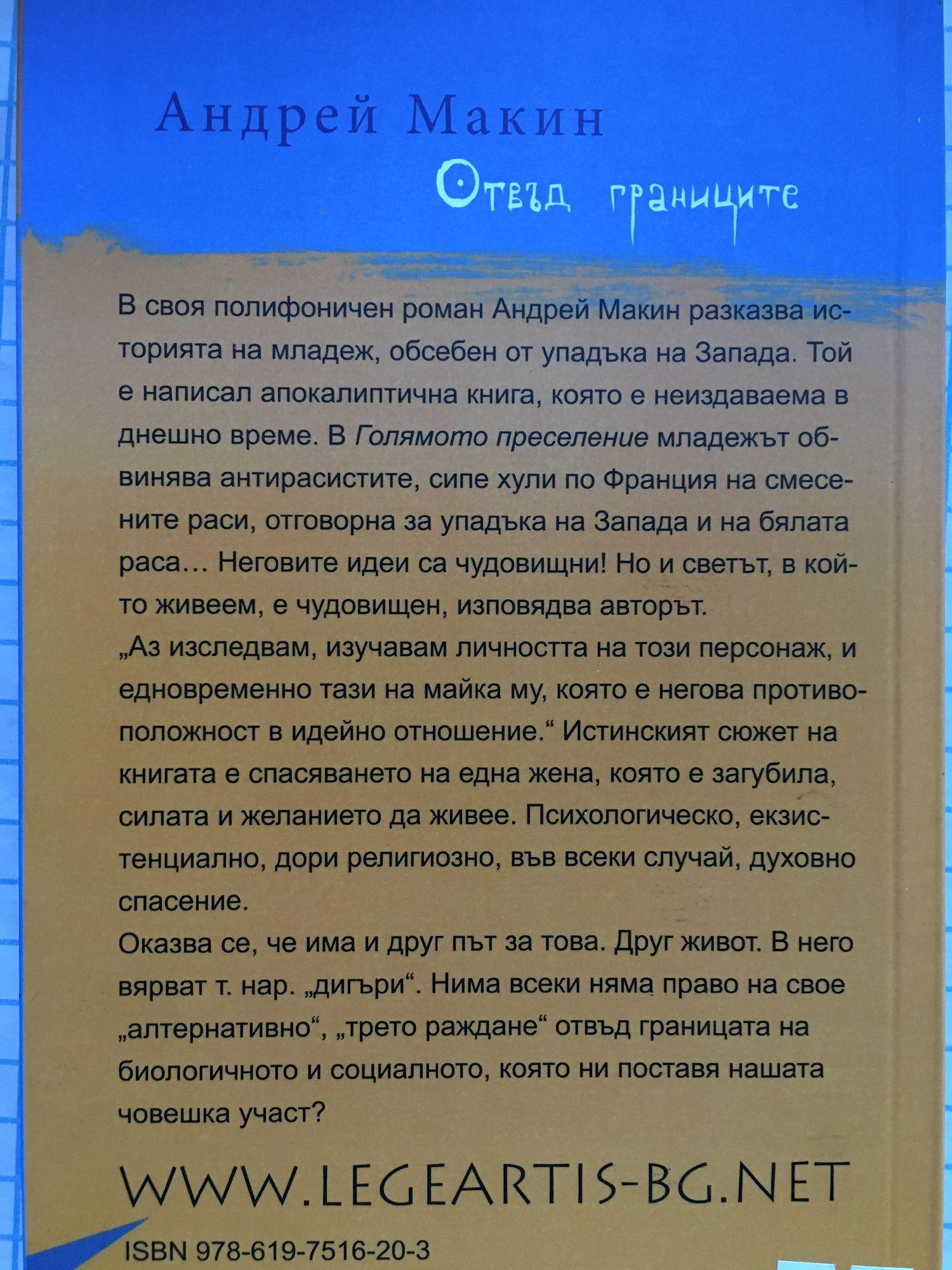 В своя полифоничен роман Андрей Макин разказва историята на младеж, обсебен от упадъка на Запада. Той е написал апокалиптична книга, която е неиздаваема в днешно време. В "Голямото преселение" младежът обвинява антирасистите, сипе хули по Франция на смесените раси, отговорна за упадъка на Запада и на бялата раса... Неговите идеи са чудовищни! Но и светът, в който живеем е чудовищен, изповядва авторът. "Аз изследвам, изучавам личността на този персонаж, и едновременно тази на майка му, която е негова противополжност в идейно отношение". Истинският сюжет на книгата е спасяването на една жена, която е загубила силата и желанието да живее. Психологическо, екзистенциално, дори религиозно, във всеки случай, духовно спасение. Оказва се, че има и друг път за това. Друг живот. В него вярват т.нар. "дигъри". Нима всеки няма право на свое "алтернативно", "трето раждане" отвъд границата на биологичното и социалното, която ни поставя нашата човешка участ?
