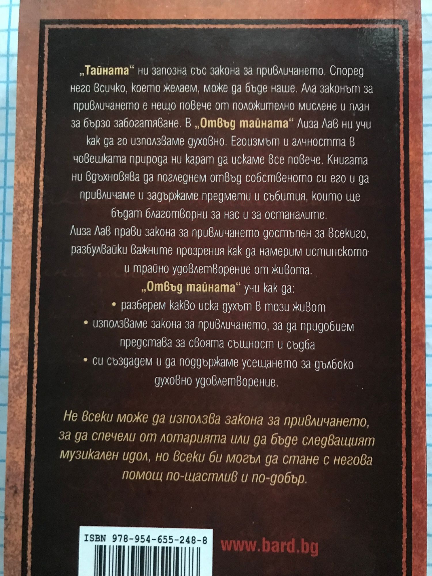 Може да имате всичко, което поискате. Ала необходимо ли е? „Тайната” ни запозна със закона за привличането. Според него всичко, което желаем, може да бъде наше. Ала законът за привличането е нещо повече от положително мислене и план за бързо забогатяване. В „Отвъд тайната” Лиза Лав ни учи как да го използваме духовно. Егоизмът и алчността в човешката природа ни карат да искаме все повече. Книгата ни вдъхновява да погледнем отвъд собственото си его и да привличаме и задържаме предмети и събития, които ще бъдат благотворни за нас и за останалите. Лиза Лав прави закона за привличането достъпен за всекиго, разбулвайки важни прозрения как да намерим истинското и трайно удовлетворение от живота. „Отвъд тайната” учи как да: разберем какво иска духът в този живот използваме закона за привличането, за да придобием представа за своята същност и съдба създадем и да поддържаме усещането за дълбоко духовно удовлетворение. Не всеки може да използва закона за привличането, за да спечели от лотарията или да бъде следващият музикален идол. Но с негова помощ всеки би могъл да стане по-щастлив и по-добър.