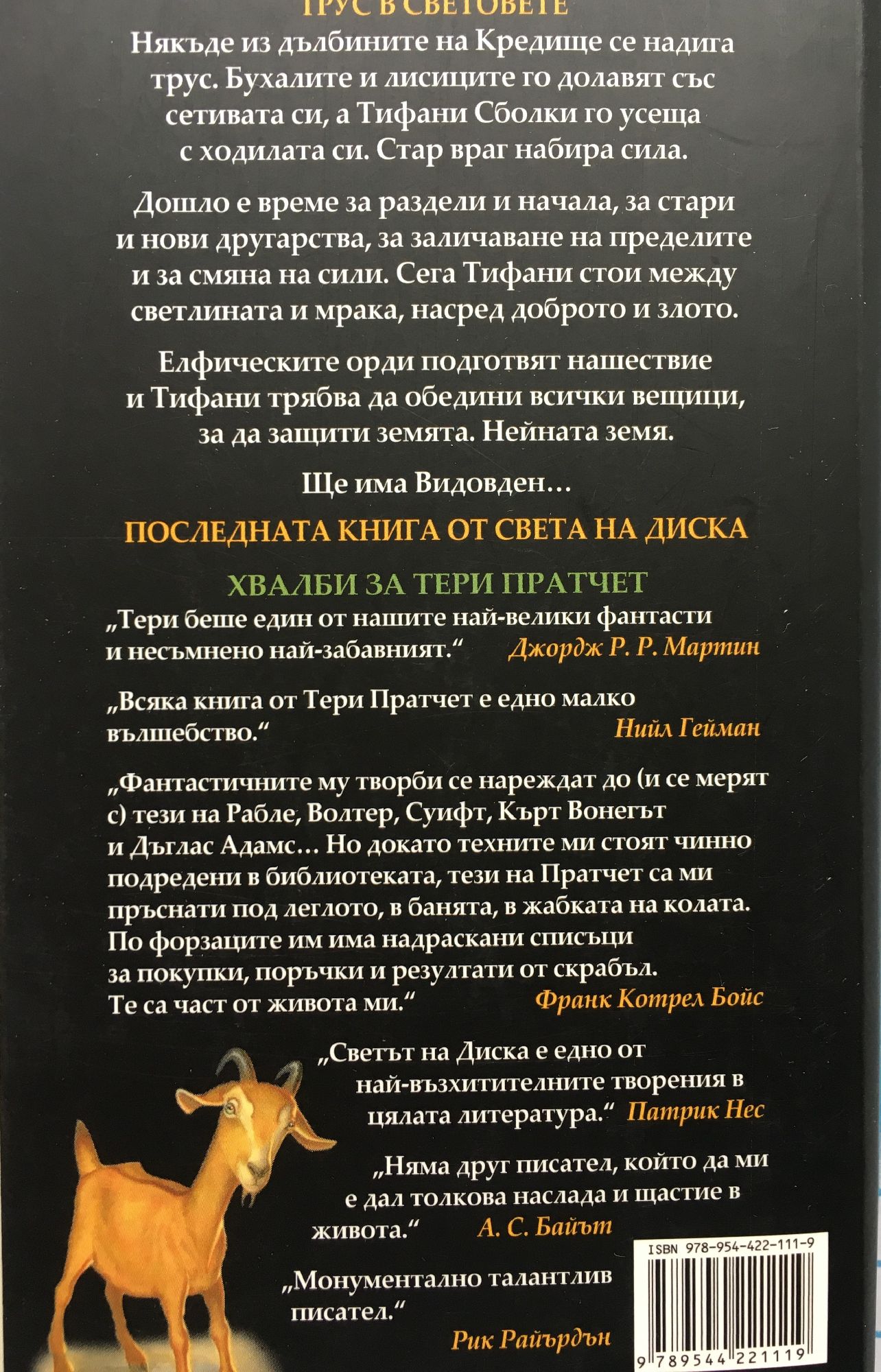 Последната книга на писателя сър Тери Пратчет с истории от Света на диска "Овчарската корона" Трус в световете Някъде из дълбините на Кредище се надига трус. Бухалите и лисиците го долавят със сетивата си, а Тифани Сболки го усеща с ходилата си. Стар враг набира сила. Дошло е време за раздели и начала, за стари и нови другарства, за заличаване на пределите и за смяна на сили. Сега Тифани стои между светлината и мрака, насред доброто и злото. Елфическите орди подготвят нашествие и Тифани трябва да обедини всички вещици, за да защити земята. Нейната земя. Ще има Видовден...