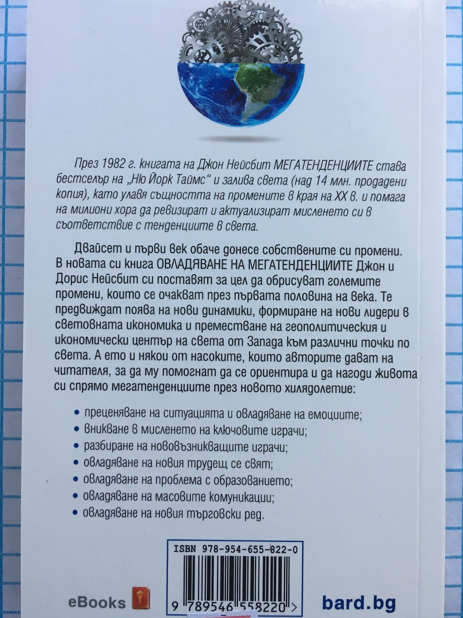 През 1982 г. книгата на Джон Нейсбит МЕГАТЕНДЕНЦИИТЕ става бестселър на „Ню Йорк Таймс“ и залива света (над 14 млн. продадени копия), като улавя същността на промените в края на ХХ в. и помага на милиони хора да ревизират и актуализират мисленето си в съответствие с тенденциите в света. Двайсет и първи век обаче донесе собствените си промени. В новата си книга ОВЛАДЯВАНЕ НА МЕГАТЕНДЕНЦИИТЕ Джон и Дорис Нейсбит си поставят за цел да обрисуват големите промени, които се очакват през първата половина на века. Те предвиждат поява на нови динамики, формиране на нови лидери в световната икономика и преместване на геополитическия и икономически център на света от Запада към различни точки по света. А ето и някои от насоките, които авторите дават на читателя, за да му помогнат да се ориентира и да нагоди живота си спрямо мегатенденциите през новото хилядолетие: - преценяване на ситуацията и овладяване на емоциите; - вникване в мисленето на ключовите играчи; - разбиране на нововъзникващите играчи; - овладяване на новия трудещ се свят; - овладяване на проблема с образованието; - овладяване на масовите комуникации; -мовладяване на новия търговски ред.