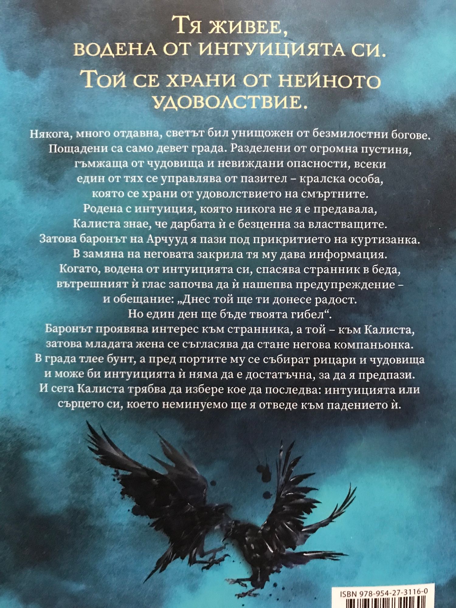Тя живее, водена от интуицията си. Той се храни от нейното удоволствие. Някога, много отдавна, светът бил унищожен от безмилостни богове. Пощадени са само девет града. Разделени от огромна пустиня, гъмжаща от чудовища и невиждани опасности, всеки един от тях се управлява от пазител – кралска особа, която се храни от удоволствието на смъртните. Родена с интуиция, която никога не я е предавала, Калиста знае, че дарбата ѝ е безценна за властващите. Затова баронът на Арчууд я пази под прикритието на куртизанка. В замяна на неговата закрила тя му дава информация. Когато, водена от интуицията си, спасява странник в беда, вътрешният й глас започва да й нашепва предупреждение – и обещание: „Днес той ще ти донесе радост. Но един ден ще бъде твоята гибел“. Баронът проявява интерес към странника, а той – към Калиста, затова младата жена се съгласява да стане негова компаньонка. В града тлее бунт, а пред портите му се събират рицари и чудовища и може би интуицията ѝ няма да е достатъчна, за да я предпази. И сега Калиста трябва да избере кое да последва: интуицията или сърцето си, което неминуемо ще я отведе към падението ѝ.