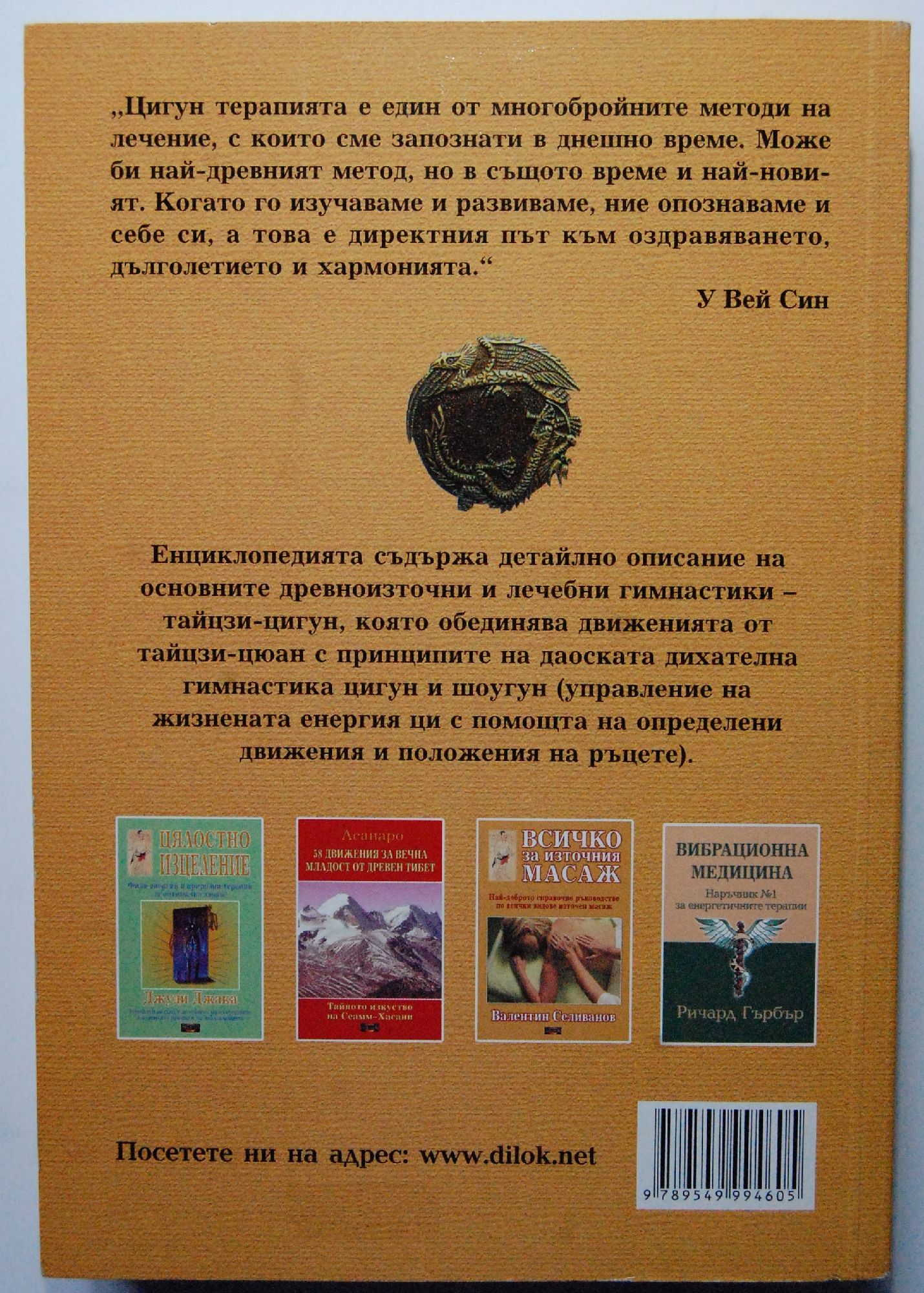 "Цигун терапията е един от многобройните методи на лечение, с които сме запознати в днешно време. Може би най-древният метод, но в същото време и най-новият. Когато го изучаваме и развиваме, ние опознаваме и себе си, а това е директния път към оздравяването, дълголетието и хармонията." У Вей Син Енциклопедията съдържа детайлно описание на основните древноизточни и лечебни гимнастики - тайцзи-цигун, която обединява движенията от тайцзи-цюан с принципите на даоската дихателна гимнастика Цигун и Шоугун (управление на жизнената енергия ци с помощта на определени движения и положения на ръцете).