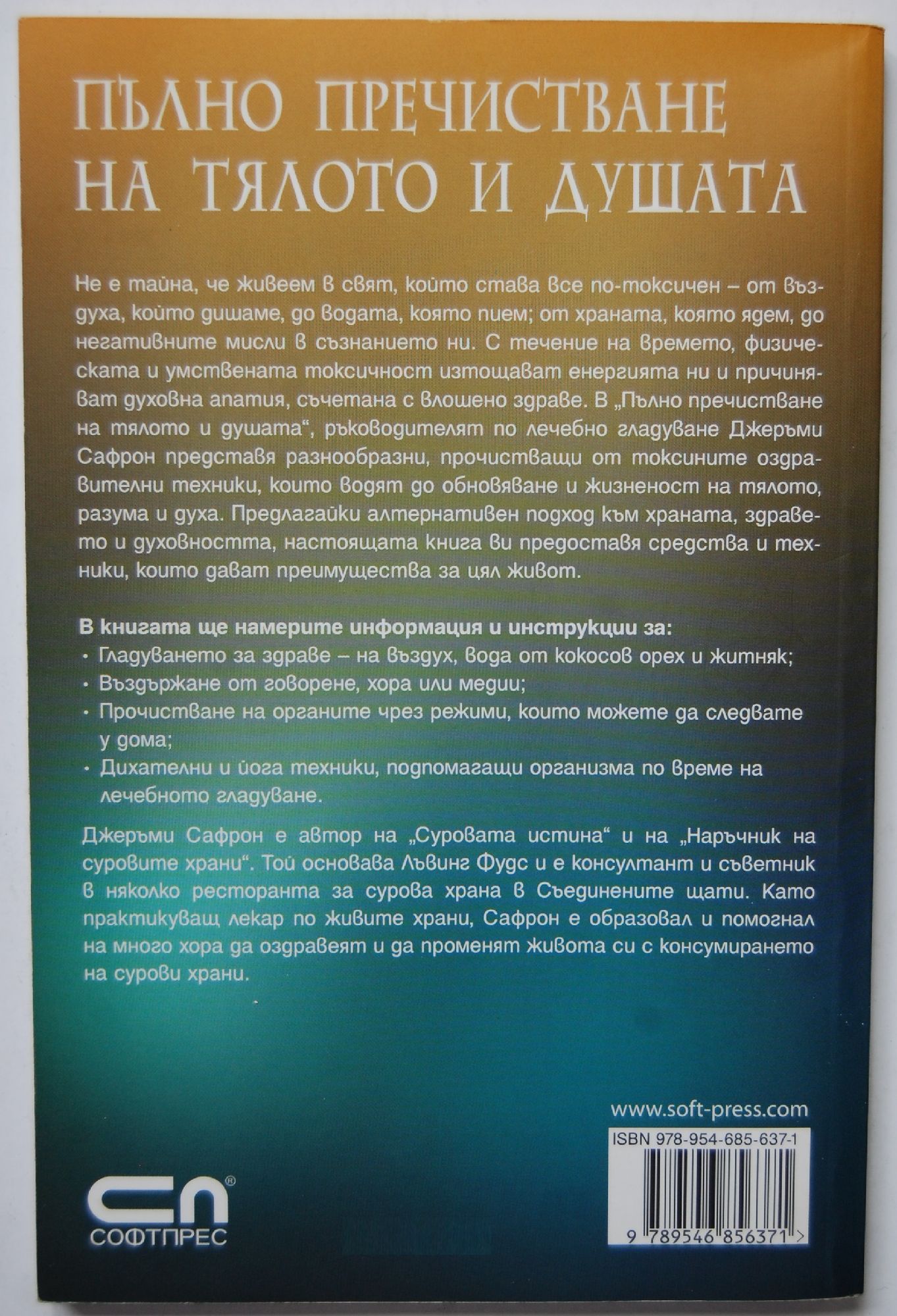 Не е тайна, че живеем в свят, който става все по-токсичен – от въздуха, който дишаме, до водата, която пием; от храната, която ядем, до негативните мисли в съзнанието ни. С течение на времето, физическата и умствената токсичност изтощават енергията ни и причиняват духовна апатия, съчетана с влошено здраве. В “Пълно пречистване на тялото и душата”, ръководителят по лечебно гладуване Джеръми Сафрон представя разнообразни, прочистващи от токсините оздравителни техники, които водят до обновяване и жизненост на тялото, разума и духа. Предлагайки алтернативен подход към храната, здравето и духовността, настоящата книга ви предоставя средства и техники, които дават преимущества за цял живот. В книгата ще намерите информация и инструкции за: * Гладуването за здраве – на въздух, вода от кокосов орех и житняк; * Въздържане от говорене, хора или медии; * Прочистване на органите чрез режими, които можете да следвате у дома; * Дихателни и йога техники, подпомагащи организма по време на лечебното гладуване. Джеръми Сафрон е автор на “Суровата истина” и на “Наръчник на суровите храни”. Той основава Лъвинг Фудс и е консултант и съветник в няколко ресторанта за сурова храна в Съединените щати. Като практикуващ лекар по живите храни, Сафрон е образовал и помогнал на много хора да оздравеят и да променят живота си с консумирането на сурови храни.