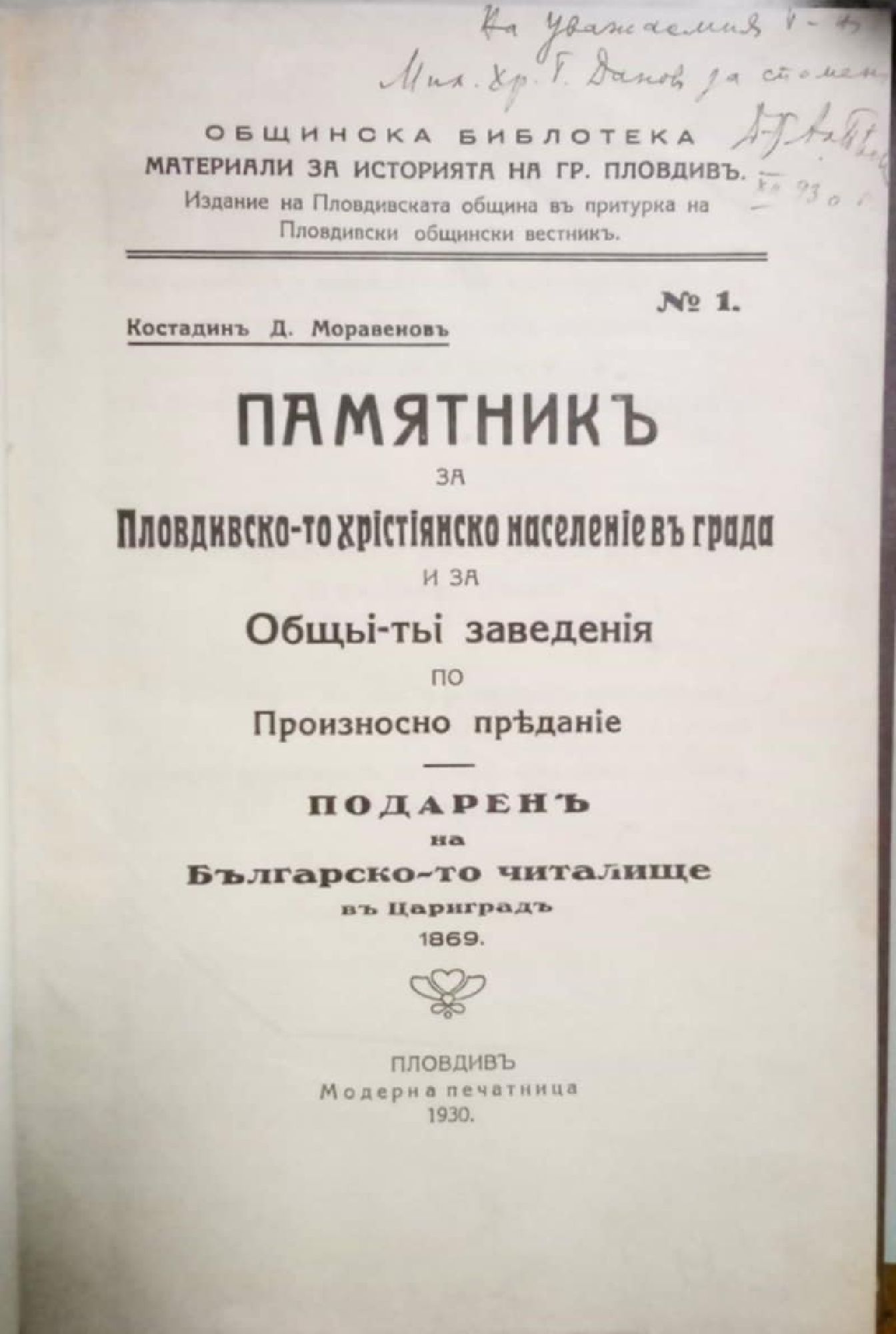 Памятникъ (памятник) за Пловдивското християнско население въ (в) града и за общите заведения по Произносно предание