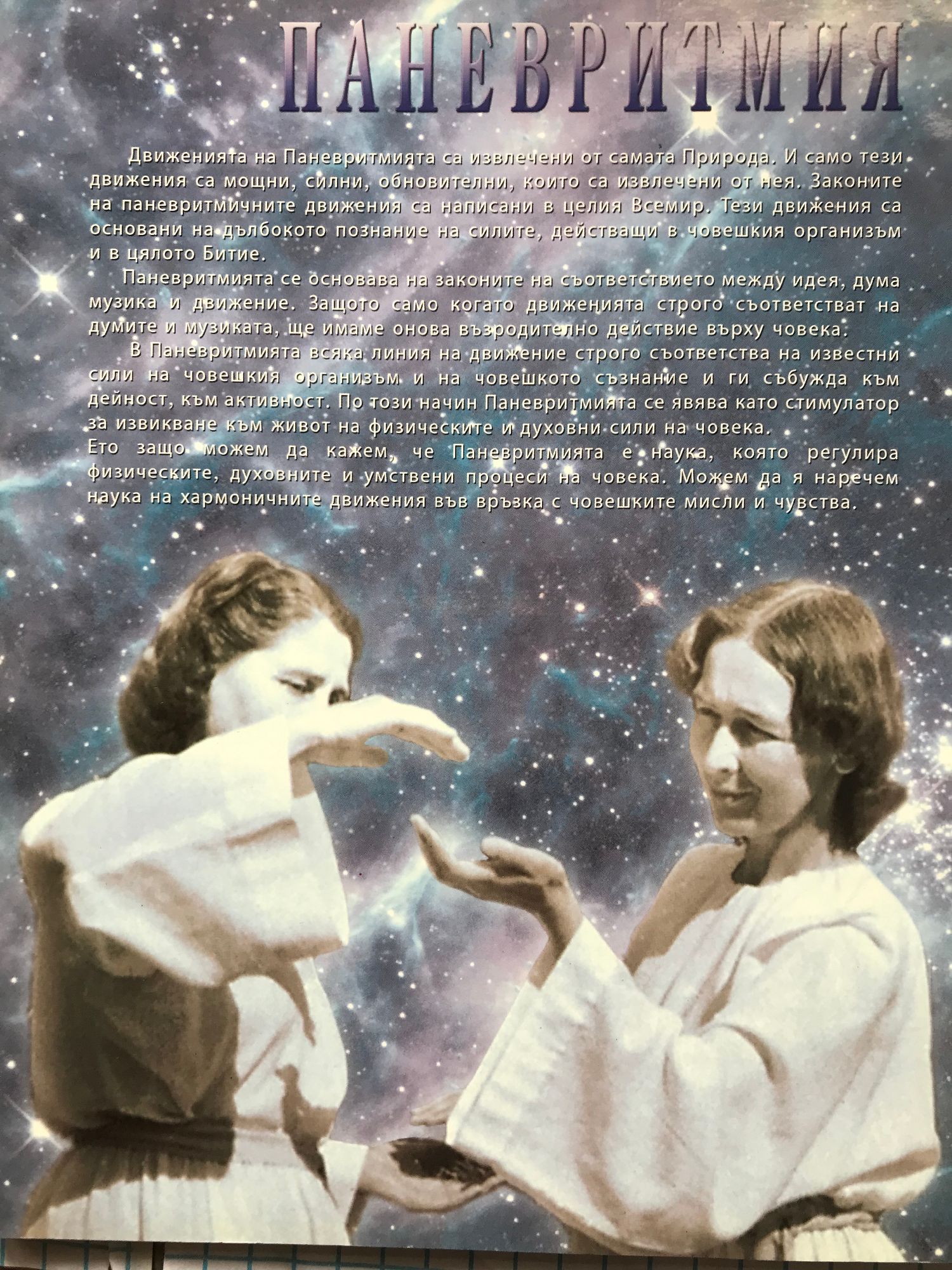 Движенията на Паневритмията са извлечени от самата Природа. и само тези движения са мощни, силни, обновителни, които са извлечени от нея. Законите на паневритмичните движения са написани в целия Всемир. Тези движения са основани на дълбокото познание на силите, действащи в човешкия организъм и в цялото Битие. Паневритмията се основава на законите на съответствието между идея, дума, музика и движение. Защото само когато движенията строго съответстват на думите и музиката, ще имаме онова възродително действие върху човека. Паневритмията е наука, която регулира физическите, духовните и умствени процеси на човека. Можем да я наречем наука на хармоничните движения във връзка с човешките мисли и чувства.
