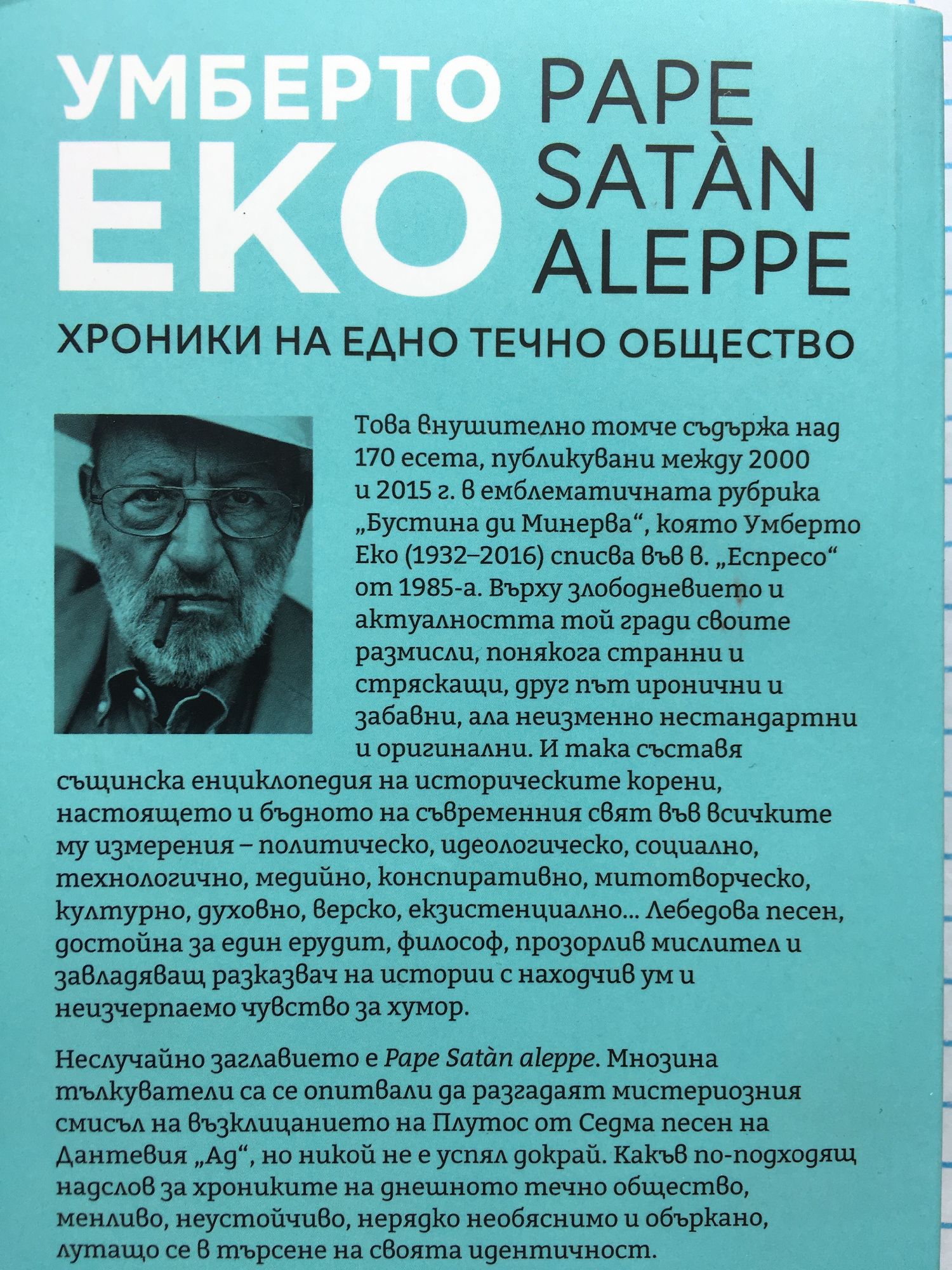 Това внушително томче съдържа над 170 есета, публикувани между 2000 и 2015 г. в емблематичната рубрика „Бустина ди Минерва“, която Умберто Еко (1932-2016) списва във в. „Еспресо“ от 1985-а. Върху злободневието и актуалността той гради своите размисли, понякога странни и стряскащи, друг път иронични и забавни, ала неизменно нестандартни и оригинални. И така съставя същинска енциклопедия на историческите корени, настоящето и бъдното на съвременния свят във всичките му измерения – политическо, идеологическо, социално, технологично, медийно, конспиративно, митотворческо, културно, духовно, верско, екзистенциално… Лебедова песен, достойна за един ерудит, философ, прозорлив мислител и завладяващ разказвач на истории с находчив ум и неизчерпаемо чувство за хумор. Неслучайно заглавието е Pape Sat?n aleppe. Мнозина тълкуватели са се опитвали да разгадаят мистериозния смисъл на възклицанието на Плутос от Седма песен на Дантевия „Ад“, но никой не е успял докрай. Какъв по-подходящ надслов за хрониките на днешното течно общество, менливо, неустойчиво, нерядко необяснимо и объркано, лутащо се в търсене на своята идентичност.