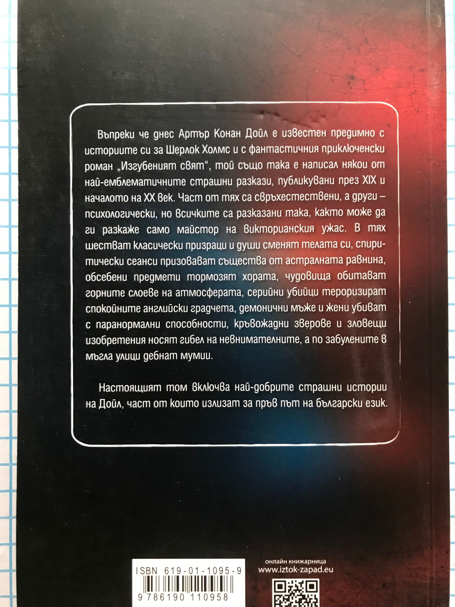 Въпреки че днес Артър Конан Дойл е известен предимно с историите си за Шерлок Холмс и с фантастичния приключенски роман „Изгубеният свят“, той също така е написал някои от най-емблематичните страшни разкази, публикувани през XIX и началото на XX век. Част от тях са свръхестествени, а други – психологически, но всичките са разказани така, както може да ги разкаже само майстор на викторианския ужас. В тях шестват класически призраци и души сменят телата си, спиритически сеанси призовават същества от астралната равнина, обсебени предмети тормозят хората, чудовища обитават горните слоеве на атмосферата, серийни убийци тероризират спокойните английски градчета, демонични мъже и жени убиват с паранормални способности, кръвожадни зверове и зловещи изобретения носят гибел на невнимателните, а по забулените в мъгла улици дебнат мумии. Настоящият том включва най-добрите страшни истории на Дойл, част от които излизат за пръв път на български език.