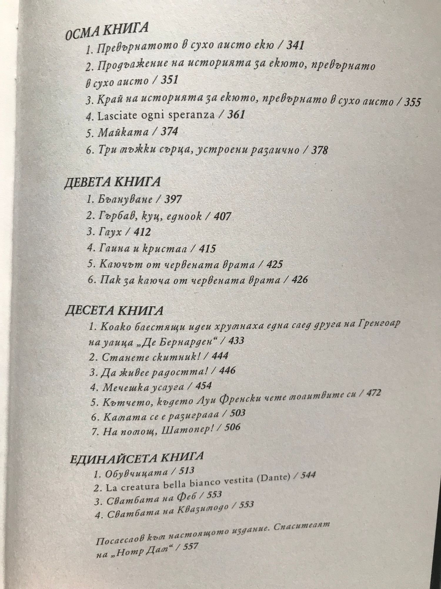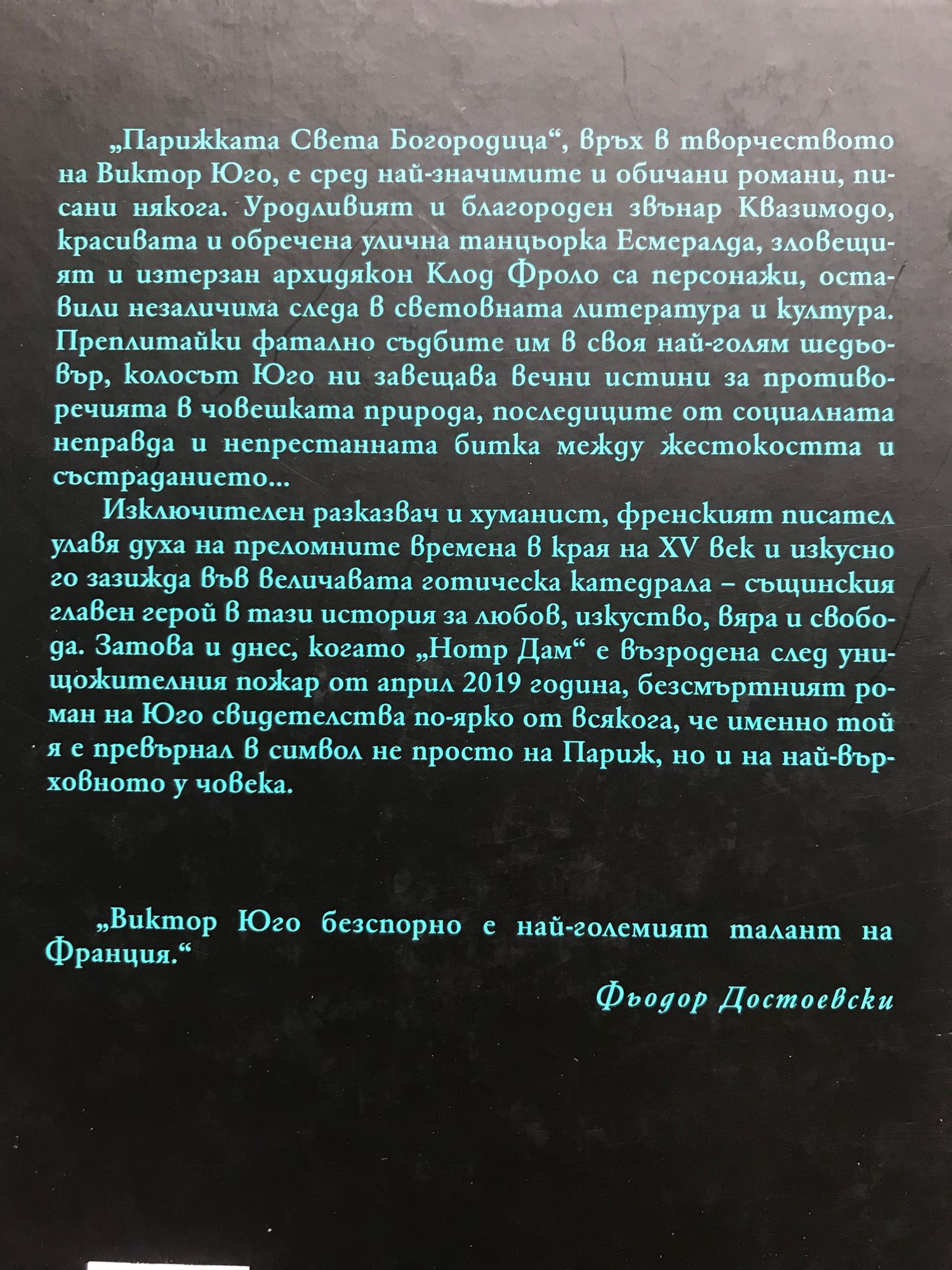 „Парижката Света Богородица“, връх в творчеството на Виктор Юго, е сред най-значимите и обичани романи, писани някога. Уродливият и благороден звънар Квазимодо, красивата и обречена улична танцьорка Есмералда, зловещият и изтерзан архидякон Клод Фроло са персонажи, оставили незаличимa следа в световната литература и култура. Преплитайки фатално съдбите им в своя най-голям шедьовър, колосът Юго ни завещава вечни истини за противоречията в човешката природа, последиците от социалната неправда и непрестанната битка между жестокостта и състраданието... Изключителен разказвач и хуманист, френският писател улавя духа на преломните времена в края на XV век и изкусно го зазижда във величавата готическа катедрала – същинския главен герой в тази история за любов, изкуство, вяра и свобода. Затова и днес, когато „Нотр Дам“ е възродена след унищожителния пожар от април 2019 година, безсмъртният роман на Юго свидетелства по-ярко от всякога, че именно той я е превърнал в символ не просто на Париж, но и на най-върховното у човека. „Виктор Юго безспорно е най-големият талант на Франция.“ Фьодор Достоевски