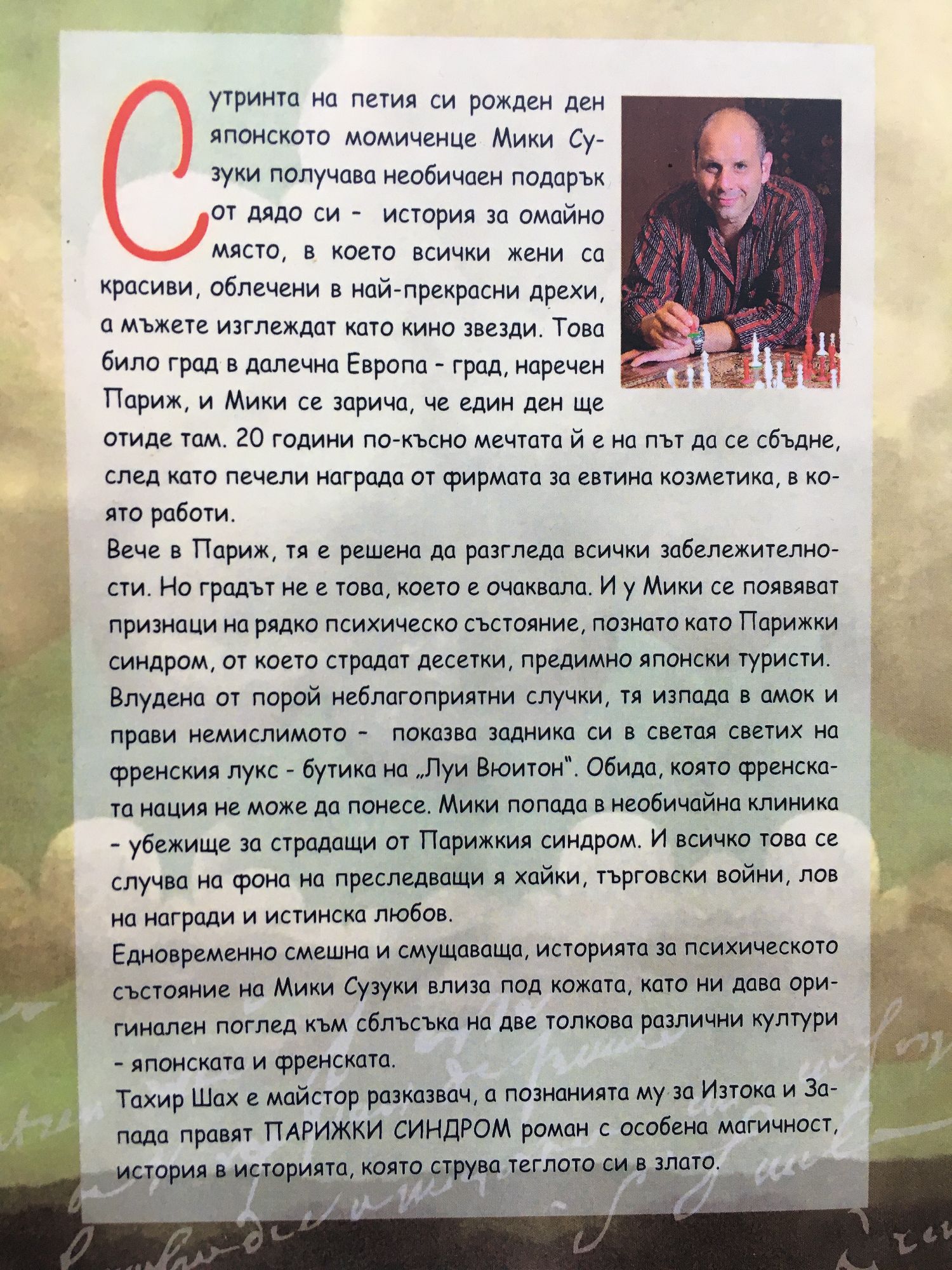 Сутринта на петия си рожден ден японското момиченце Мики Сузуки получава необичаен подарък от дядо си - история за омайно място, в което всички жени са красиви, облечени в най-прекрасни дрехи, а мъжете изглеждат като кино звезди. Това било град в далечна Европа - град, наречен Париж, и Мики се зарича, че един ден ще отиде там. 20 години по-късно мечтата й е на път да се сбъдне, след като печели награда от фирмата за евтина козметика, в която работи. Вече в Париж, тя е решена да разгледа всички забележителности. Но градът не е това, което е очаквала. И у Мики се появяват признаци на рядко психическо състояние, познато като Парижки синдром, от което страдат десетки, предимно японски туристи. Влудена от порой неблагоприятни случки, тя изпада в амок и прави немислимото - показва задника си в светая светих на френския лукс - бутика на "Луи Вюитон". Обида, която френската нация не може да понесе. Мики попада в необичайна клиника - убежище за страдащи от Парижкия синдром. И всичко това се случва на фона на преследващи я хайки, търговски войни, лов на награди и истинска любов. Едновременно смешна и смущаваща, историята за психическото състояние на Мики Сузуки влиза под кожата, като ни дава оригинален поглед към сблъсъка на две толкова различни култури - японската и френската. Тахир Шах е майстор разказвач, а познанията му за Изтока и Запада правят "Парижки синдром" роман с особена магичност в историята, която струва теглото си в злато.