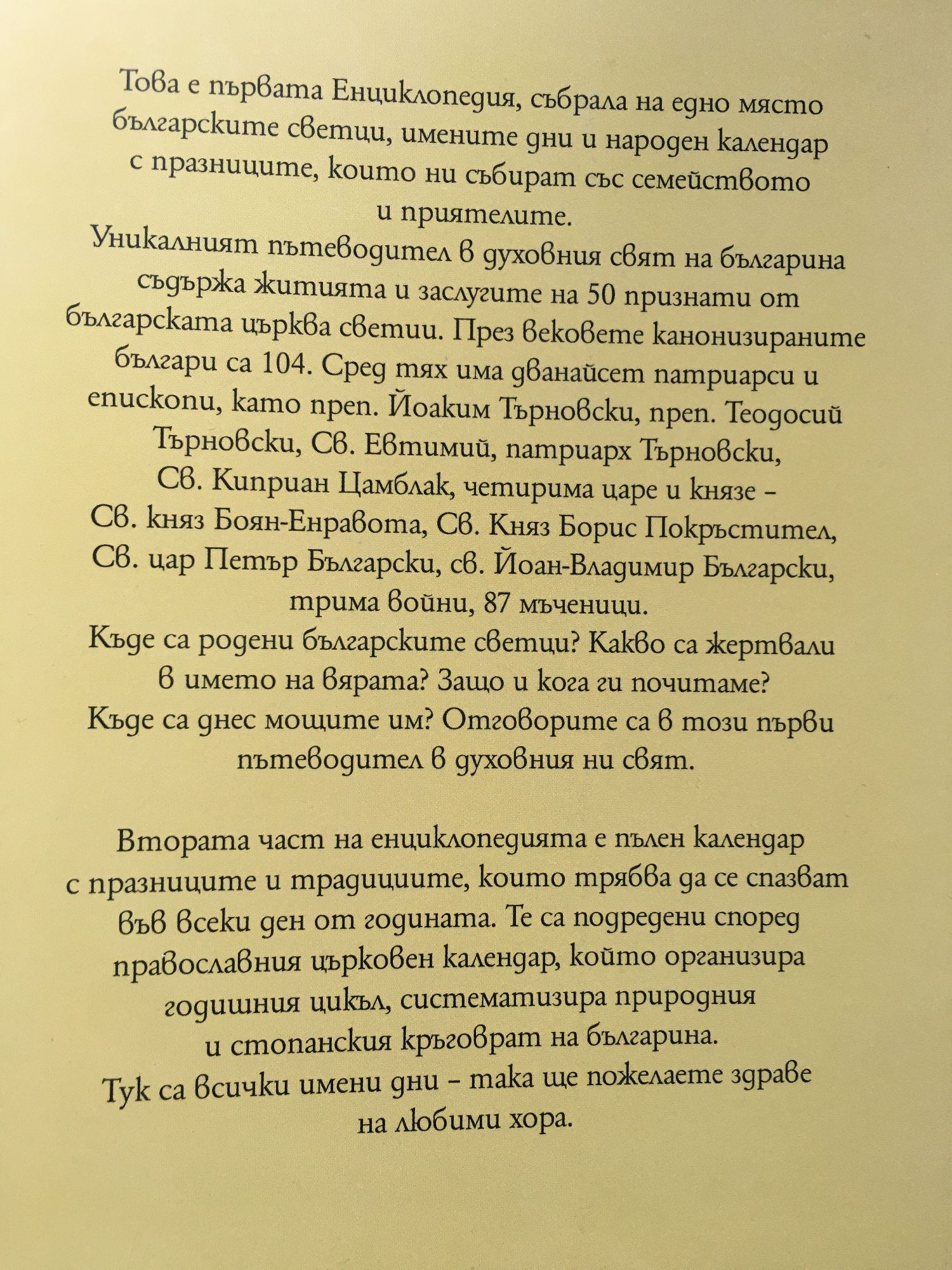 Това е първата Енциклопедия, събрала на едно място българските светци, имените дни и народен календар с празниците, които ни събират със семейството и приятелите. Уникалният пътеводител в духовния свят на българина съдържа житията и заслугите на 50 признати от българската църква светии. През вековете канонизираните българи са 104. Сред тях има дванайсет патриарси и епископи, катo преп. Йоаким Търновски, преп. Теодосий Търновски, Св. Евтимий, патриарх Търновски, Св. Киприан Цамблак, четирима царе и князе – Св. княз Боян-Енравота, Св. Княз Борис Покръстител, Св. цар Петър Български, св. Йоан-Владимир Български, трима войни, 87 мъченици. Къде са родени българските светци? Какво са жертвали в името на вярата? Защо и кога ги почитаме? Къде са днес мощите им? Отговорите са в този първи пътеводител в духовния ни свят. Втората част на енциклопедията е пълен календар с празниците и традициите, които трябва да се спазват във всеки ден от годината. Те са подредени според православния църковнопразничен календар, който организира годишния цикъл, систематизира природния и стопанския кръговрат на българина. Тук са всички имени дни - така ще пожелаете здраве на любими хора.