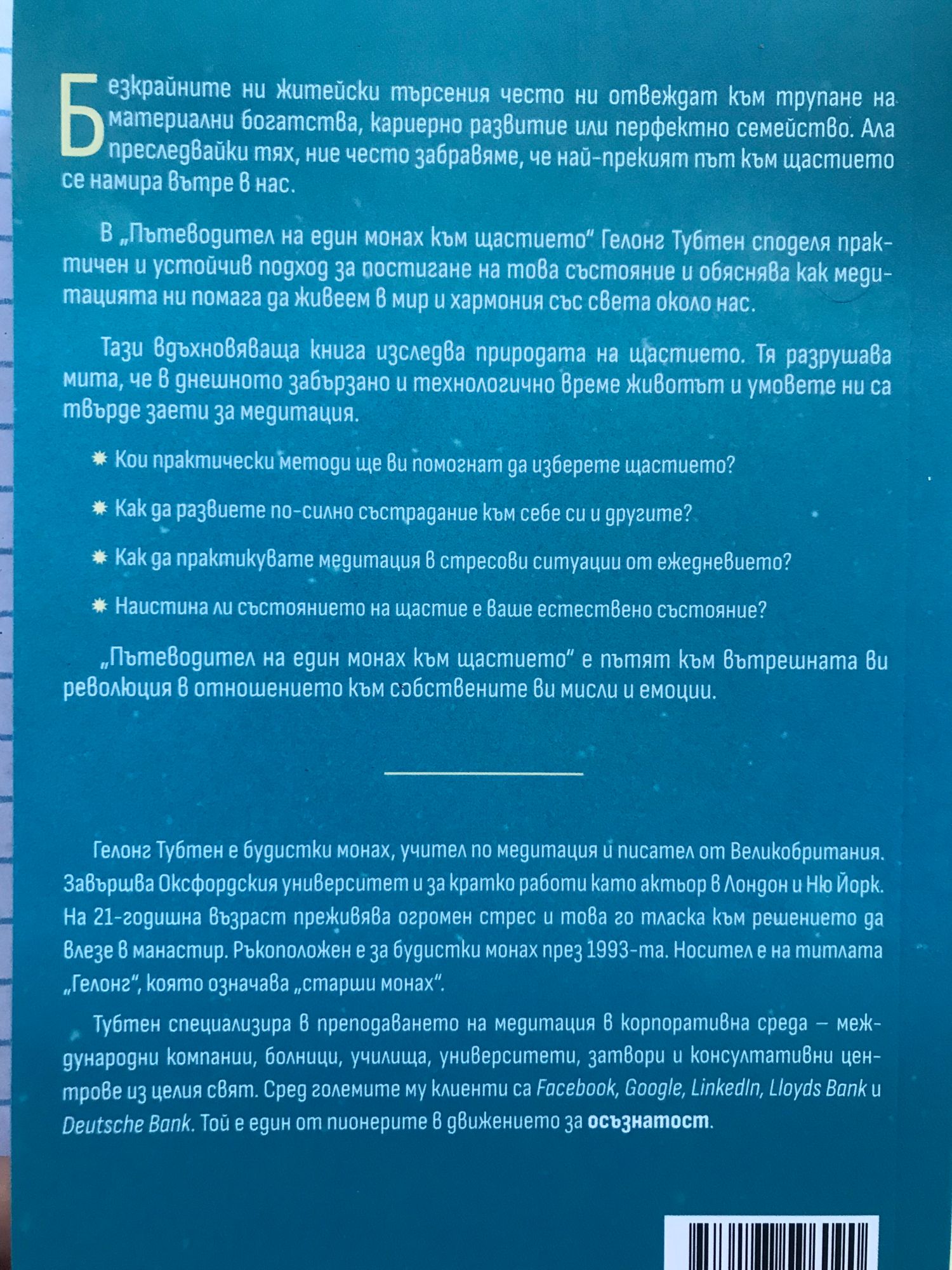 Безкрайните ни житейски търсения често ни отвеждат към трупане на материални богатства, кариерно развитие или перфектно семейство. Ала преследвайки тях, ние често забравяме, че най-прекият път към щастието се намира вътре в нас. В "Пътеводител на един монах към щастието" Гелонг Тубтен споделя практичен и устойчив подход за постигане на това състояние и обяснява как медитацията ни помага да живеем в мир и хармония със света около нас. Тази вдъхновяваща книга изследва природата на щастието. Тя разрушава мита, че в днешното забързано и технологично време животът и умовете ни са твърде заети за медитация. От книгата ще научите: - Кои практически методи ще ви помогнат да изберете щастието? - Как да развиете по-силно състрадание към себе си и другите? - Как да практикувате медитация в стресови ситуации от ежедневието? - Наистина ли състоянието на щастие е ваше естествено състояние? "Пътеводител на един монах към щастието" е пътят към вътрешната ви революция в отношението към собствените ви мисли и емоции.
