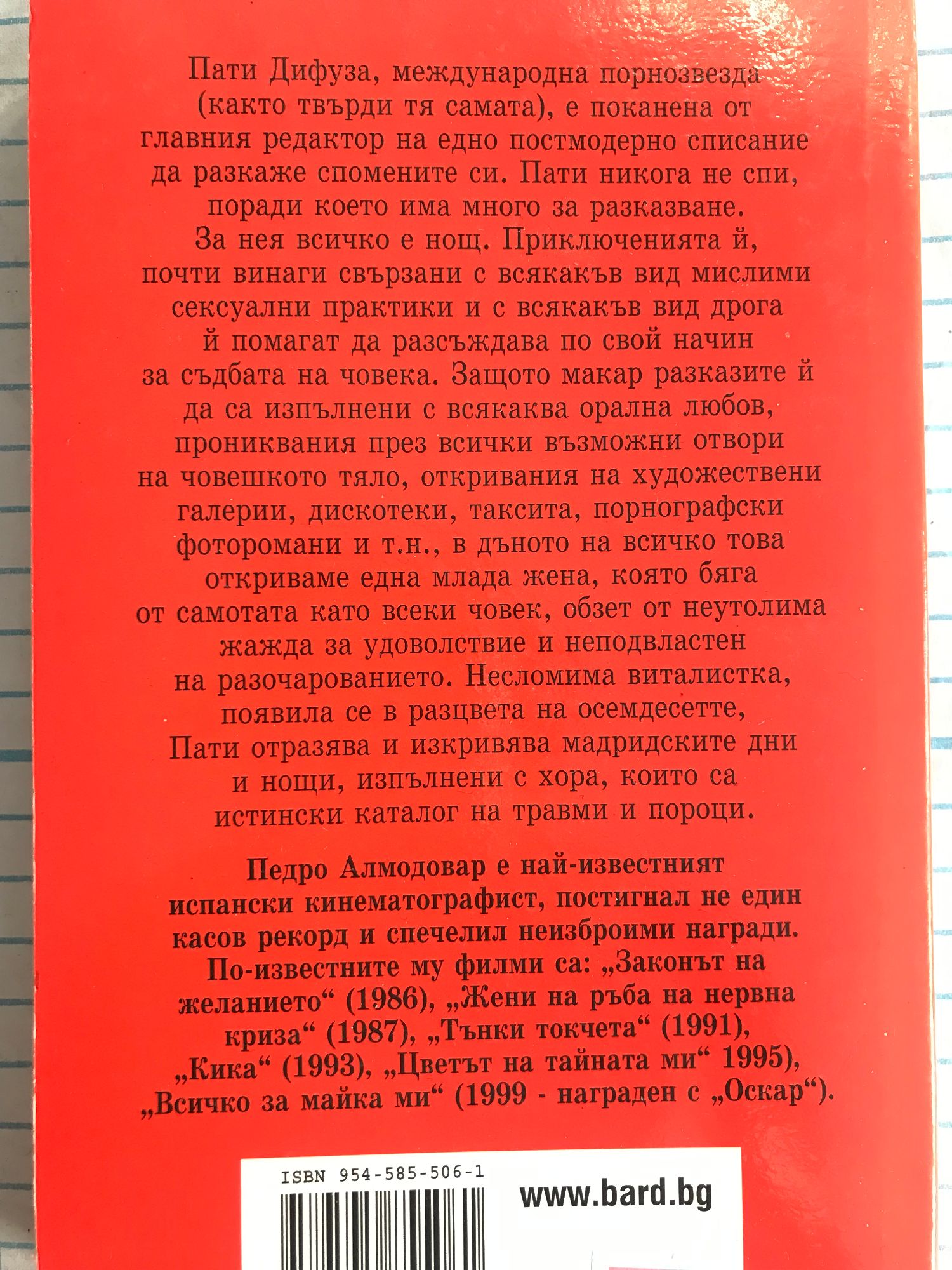 Пати Дифуза, международна порнозвезда (както твърди самата тя), е поканена от главния редактор на едно постмодерно списание да разкаже спомените си. Пати никога не спи, поради което има много за разказване. За нея всичко е нощ. Приключенията ѝ, почти винаги свързани с всякакъв вид мислими сексуални практики и с всякакъв вид дрога, ѝ помагат да разсъждава по свой начин за съдбата на човека. Защото макар разказите ѝ да са изпълнени с орална любов, прониквания през всички възможни отвори на човешкото тяло, откривания на художествени галерии, дискотеки, таксита, порнографски фоторомани и т.н., в дъното на всичко това откриваме една млада жена, която бяга от самотата като всеки човек, обзет от неутолима жажда за удоволствие и неподвластен на разочарованието. Несломима виталистка, рожба на осемдесетте, Пати отразява и показва изкривения образ на мадридските дни и нощи, изпълнени с хора – истински каталог на травми и пороци.
