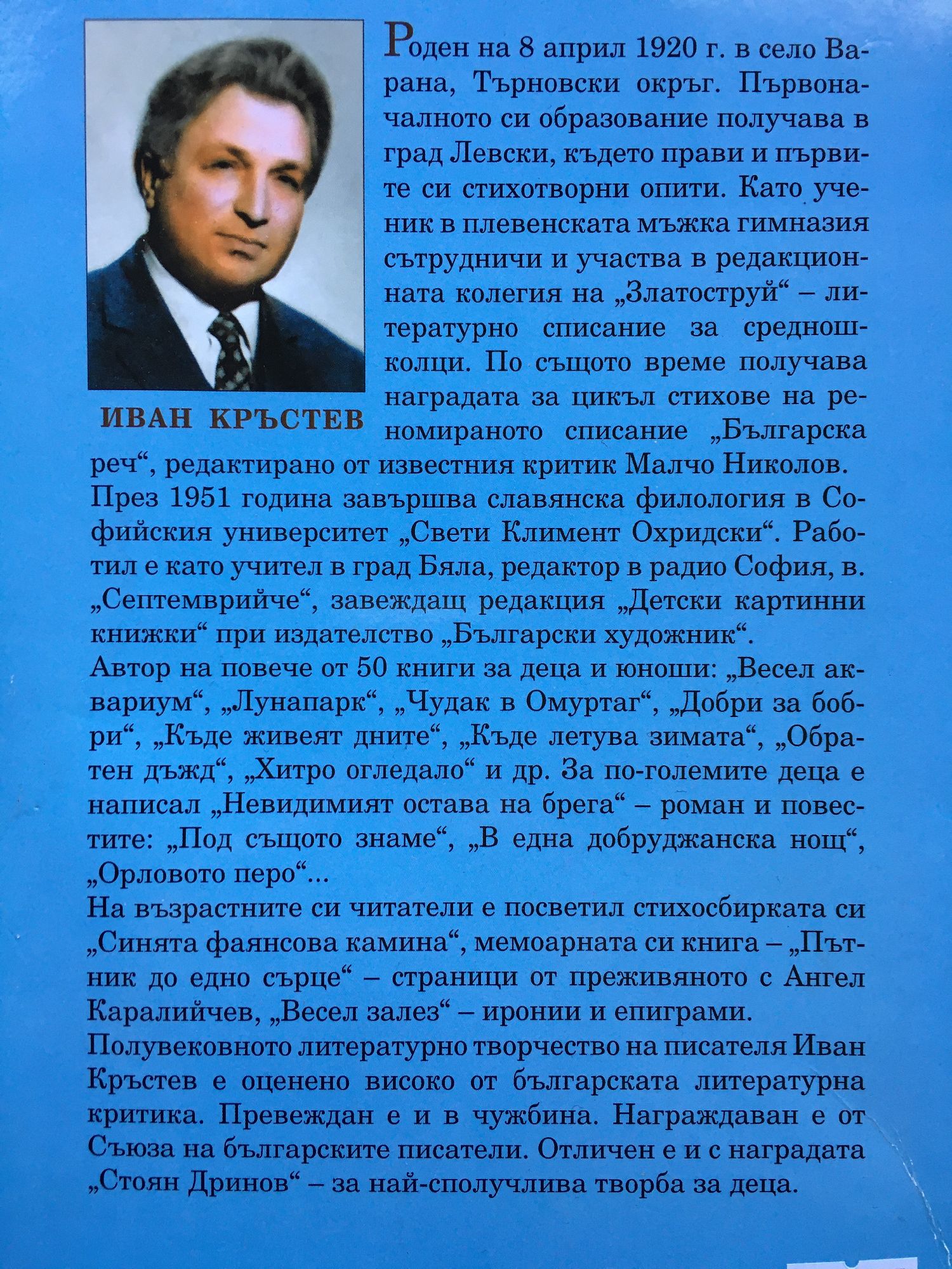 Иван Кръстев Иванов, български писател и автор на произведения за деца, е роден на 08.04.1920 г. в село Варана, Плевенско. Първоначалното си образование получава в гр. Левски, където прави първите си стихотворни опити. Като ученик в Плевенската мъжка гимназия сътрудничи и участва в редактирането на средношколското списание „Златоструй”. Завършва гимназия в Плевен през 1942 г. и славянска филология в Софийския университет (1951). Учителства в Бяла, София (1959-1962). Редактор в Радио София (1947-1951), във вестник “Септемврийче” (1951-1959), завежда редакция “Детски картинни книжки” в изд. “Български художник” от 1962 г. Автор е на повече от 50 книги за деца и юноши, издадени в приблизително 2 милиона тираж. За по-големите деца е написал “В ябълковата градина” (приказки, 1973), “Орловото перо” (повест за деца, 1969), “В една добруджанска нощ” (повест за юноши, 1971), “Далечните похитители” (роман, 1975), „Невидимият „Весел аквариум”, „Луна парк”, „Чудак в Омуртаг”, „Добри за борби”, „Къде живеят дните”, „Къде летува зимата”, „Обратен дъжд”, „Хитро огледало”, „Шарено кълбо” (избрано), „Остава на брега” (роман) и „Под същото знаме”. Голяма част от произведенията му са пропити с патриотична и родолюбива тематика. На възрастните си читатели е посветил стихосбирката „Синята фаянсова камина” (лирика, 2008), мемоарната си книга „Пътник до едно сърце” (страници от преживяното с Ангел Каралийчев, 2002) и „Весел залез” (иронии и епиграми). Член на СБП, многократно награждаван за произведенията си с детско-юношеска тематика. Негови творби са превеждани и в чужбина. Живее в София.