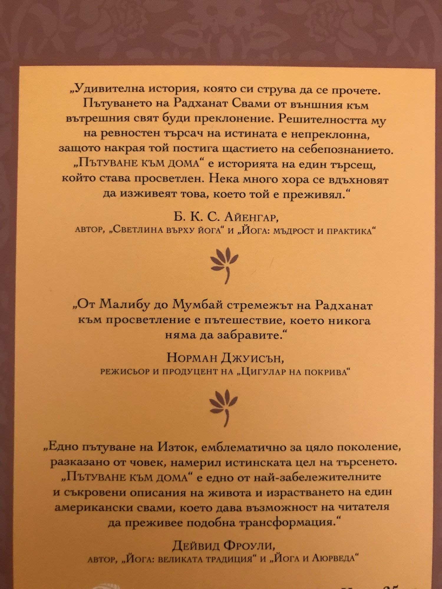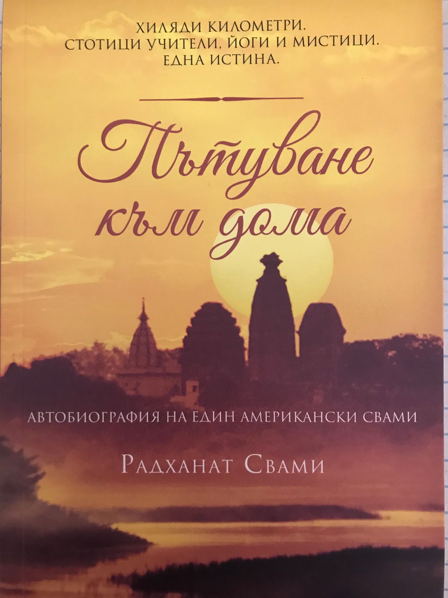 Хиляди километри, стотици учители, йоги и мистици. Една истина. Удивителна история, която си струва да се прочете. Пътуването на Радханат Свами от външния към вътрешния свят буди преклонение. Решителността му на ревностен търсач на истината е непреклонна, защото накрая той постига щастието на себепознанието. "Пътуване към дома" е историята на един търсещ, който става просветлен. Нека много хора се вдъхновят да изживеят това, което той е преживял. (Б.К.С.Айенгар,автор на "Светлина върху йога" и "Йога: мъдрост и практика)