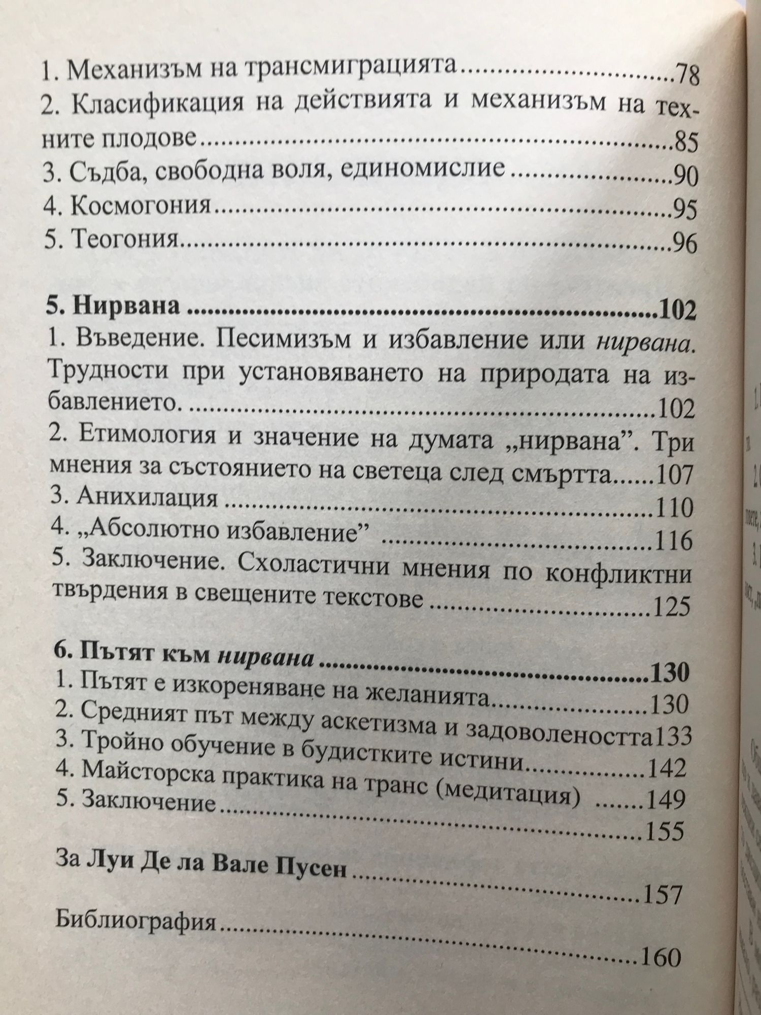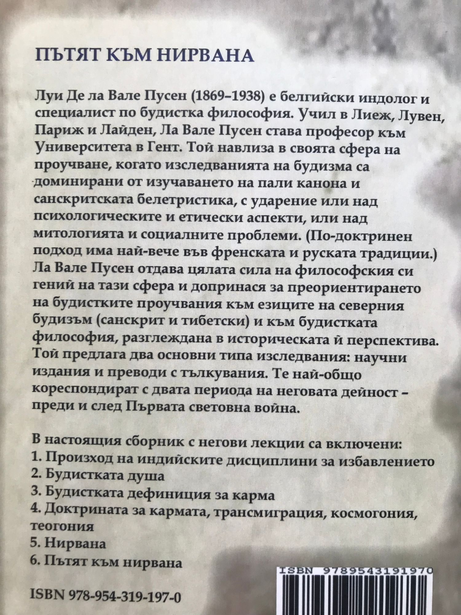 Луи Де ла Вале Пусен (1869 - 1938) е белгийски индолог и специалист по будистка философия. Учил в Лиеж, Лувен, Париж и Лайден, Ла Вале Пусен става професор към университета в Гент. Той навлиза в своята сфера на проучване, когато изследванията на будизма са доминирани от изучаването на пали канона и санскритската белетристика, с ударение или над психологическите и етически аспекти, или над митологията и социалните проблеми. (По-доктринен подход има най-вече във френската и руската традиции.) Ла Вале Пусен отдава цялата сила на философския си гений на тази сфера и допринася за преориентирането на будистките проучвания към езиците на северния будизъм (санскрит и тибетски) и към будистката философия, разглеждана в историческата й перспектива. Той предлага два основни типа изследвания: научни издания и преводи с тълкувания. Те най-общо кореспондират с двата периода на неговата дейност - преди и след Първата световна война. В настоящия сборник с негови лекции са включени: 1. Произход на индийските дисциплини за избавлението 2. Будистката душа 3. Будистката дефиниция за карма 4. Доктрината за кармата, трансмиграция, космогония, теогония 5. Нирвана 6. Пътят към нирвана