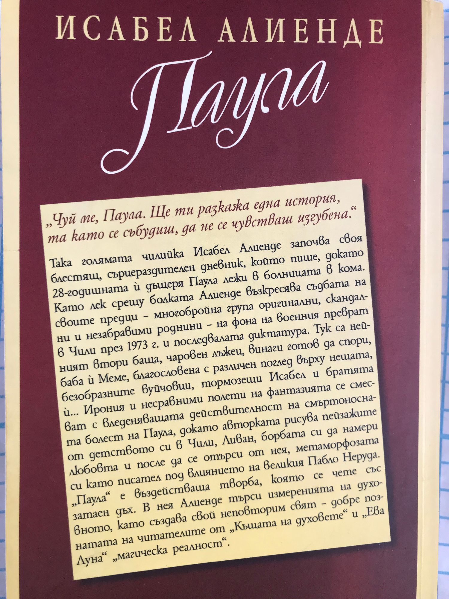 "Чуй ме, Паула. Ще ти разкажа една история, та като се събудиш, да не се чувстваш изгубена." Така голямата чилийка Исабел Алиенде започва своя блестящ, сърцераздителен дневник, който пише, докато 28-годишната й дъщеря Паула лежи в болницата в кома. Като лек срещу болката Алиенде възкресява съдбата на своите предци - многобройна група оригинални, скандални и незабравими роднини - на фона на военния преврат в Чили през 1973 г. и последвалата диктатура. Тук са нейният втори баща, чаровен лъжец, винаги готов да спори, баба й Меме, благословена с различен поглед върху нещата, безобразните вуйчовци, тормозещи Исабел и братята й... Ирония и несравними полети на фантазията се смесват с вледеняващата действителност на смъртоносната болест на Паула, докато авторката рисува пейзажите от детството си в Чили, Ливан, борбата си да намери любовта и после да се отърси от нея, метаморфозата си като писател под влиянието на великия Пабло Неруда. "Паула" е въздействаща творба, която се чете със затаен дъх. В нея Алиенде търси измеренията на духовното, като създава свой неповторим свят - добре познатата на читателите от "Къщата на духовете" и "Ева Луна" "магическа реалност".