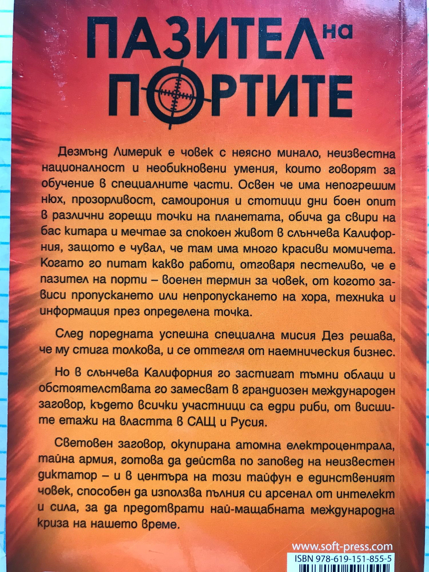 Дезмънд Лимерик е човек с неясно минало, неизвестна националност и необикновени умения, които говорят за обучение в специалните части. Освен че има непогрешим нюх, прозорливост, самоирония и стотици дни боен опит в различни нагорещени точки на планетата, обича да свири на бас китара и мечтае за спокоен живот в слънчева Калифорния, защото е чувал, че там има много красиви момичета. Когато го питат какво работи, отговаря пестеливо, че е пазител на порти – военен термин за човек, от когото зависи пропускането или непропускането на хора, техника и информация през определена точка. След поредната успешна специална мисия Дез решава, че му стига толкова и се оттегля от наемническия бизнес. Но в слънчева Калифорния го застигат тъмни облаци и обстоятелствата го замесват в грандиозен международен заговор, където всички участници са едри риби, окупирали висшите етажи на властта в САЩ и Русия. Световен заговор, окупирана атомна електроцентрала, тайна армия, готова да действа по заповед на неизвестен диктатор – и в центъра на този тайфун единственият човек, способен да използва пълния си арсенал от интелект и сила, за да предотврати най-мащабната международна криза на нашето време.